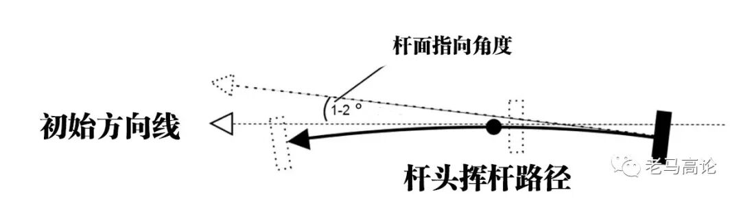 在通常站姿下,杆头的挥动轨迹呈弧线;而杆面,在上杆过程呈“开放”状,在下杆过程呈“关闭”状。如下图: