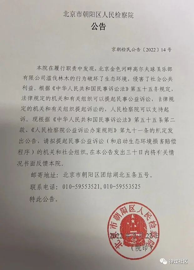 本院在履行职责中发现,北京金色河畔高尔夫球俱乐部有限公司滥伐林木的行为破坏了生态环境,造成社会公共利益受到损害。根据《中华人民共和国民事诉讼法》第五十五条规定,法律规定的机关和有关组织可以提起民事公益诉讼,法律规定的机关和有关组织提起诉讼的,人民检察院可以支持起诉。现根据《中华人民共和国民事诉讼法》第五十五条第二款、《人民检察院公益诉讼办案规则》第九十一条的规定发出公告,请拟提起民事公益诉讼(和启动生态环境损害赔偿程序)的机关和社会组织,在本公告发出三十日内将有关情况书面反馈本院。