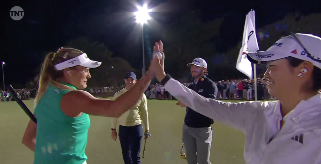不过,由于一个月没打比赛——事实上,张斯洋透露,为了学习,本周甚至是她一个月来第一次下场 (反观小麦和霍马今年已打了5站比赛,汤普森上周还去沙特打了女子欧巡)!斯坦福学子略为遗憾地,未能赢得一洞 (skin),不过收官洞第12洞,张斯洋还是以一记树丛中的精彩救球保帕,赢得了满堂彩,也将战局逼到加洞,让最后4洞累积的160万美元奖金留到了“最近旗杆”对决的延长赛中。