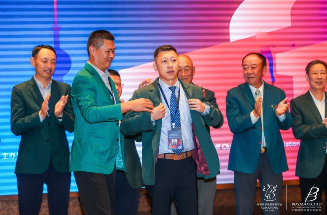在总联会联合创始人、第二届总联会承办球会昆明春城湖畔度假村时任总经理杨辉光先生,中国高尔夫球协会职业经理人委员会顾问、第四届总联会承办球会深圳沙河高尔夫球会时任总经理陈朝行先生,第五届总联会承办球会上海旭宝高尔夫球会时任常务副总经理黄沧江先生,第六届总联会承办球会湖南青竹湖国际高尔夫球会时任总经理谢磊先生,第七届总联会承办球会丽江玉龙雪山高尔夫球会时任总经理和献中先生,第十二届总联会承办球会海口观澜湖高尔夫球会时任总经理杨青先生,第十五届总联会承办球会石岛旅游休闲度假区高尔夫俱乐部时任总经理王东先生,第十七届总联会承办球会庐山国际高尔夫球会董事长凌云先生、总经理喻湘闽先生,第二十届总联会承办球会广州南沙高尔夫球会常务副总经理林春阳女士等多位历届总联会承办球会的总经理和业主的现场见证下,第二十三届总联会承办球会湖州温泉高尔夫俱乐部总经理严东海先生为君兰国际高尔夫俱乐部总经理李昊先生穿上象征传统与胜利,并印有年会会徽的绿夹克!