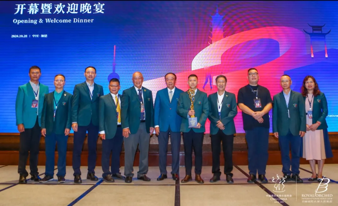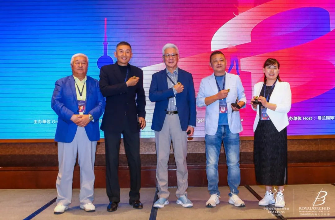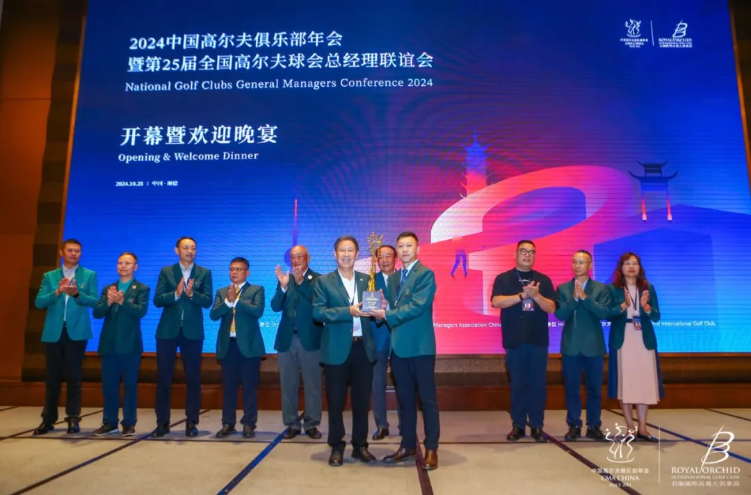 在欢迎晚宴上,第四届总联会承办球会深圳沙河高尔夫球会时任总经理陈朝行先生将承办纪念奖杯颁发给本届年会承办球会君兰国际高尔夫俱乐部,总经理李昊先生作为球会代表接过了这份沉甸甸的荣誉。