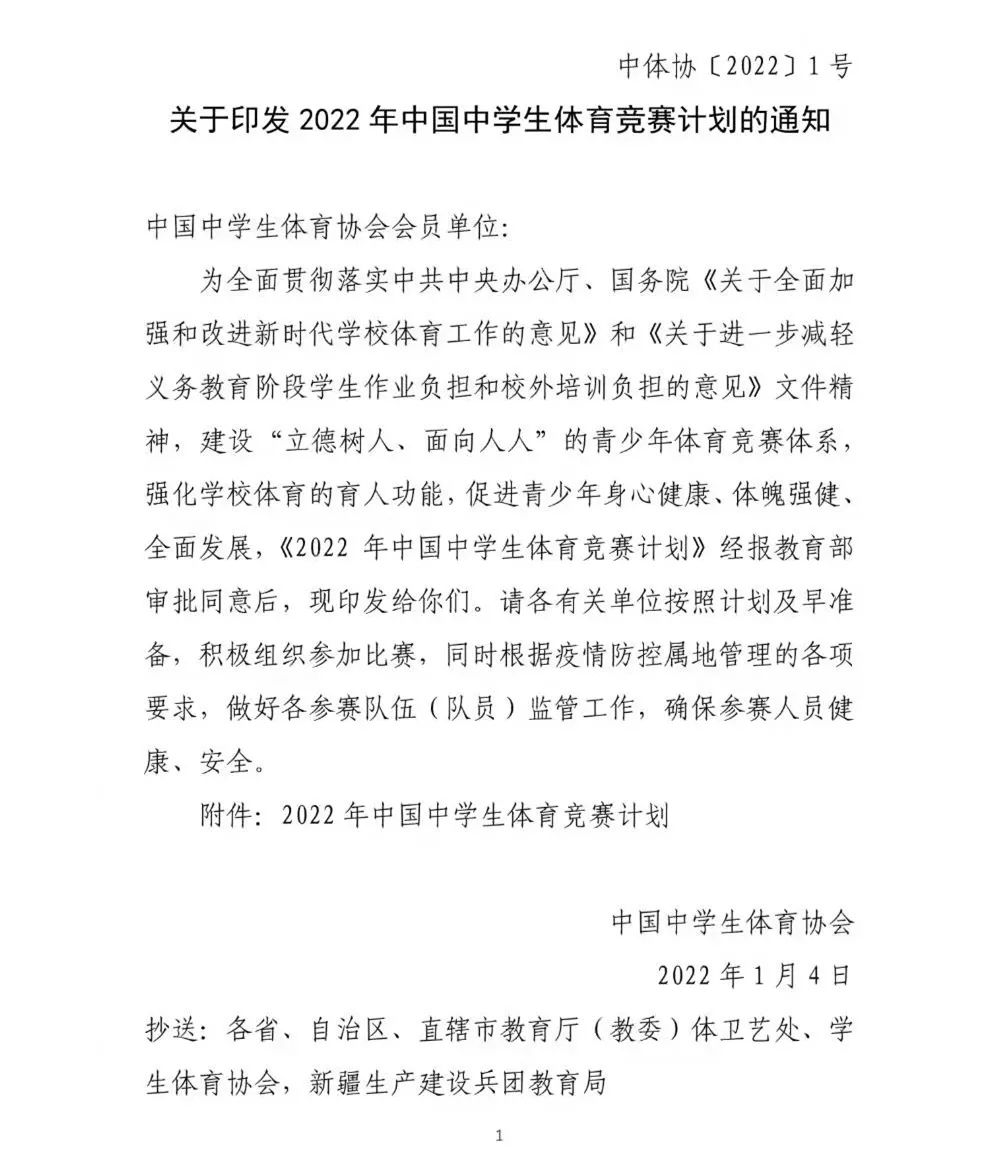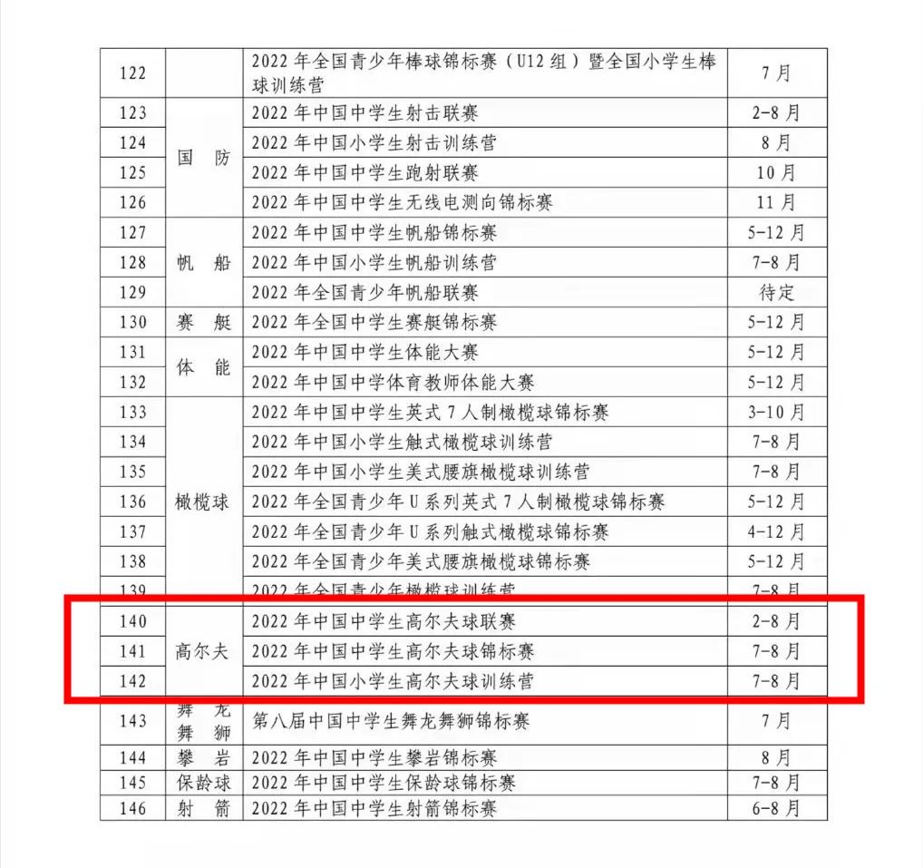 2022年1月4日,中国中学生体育协会发布中体协〔2022〕1号文《关于印发2022年中国中学生体育竞赛计划的通知》,高尔夫项目首次被纳入中国中学生体育竞赛计划项目。