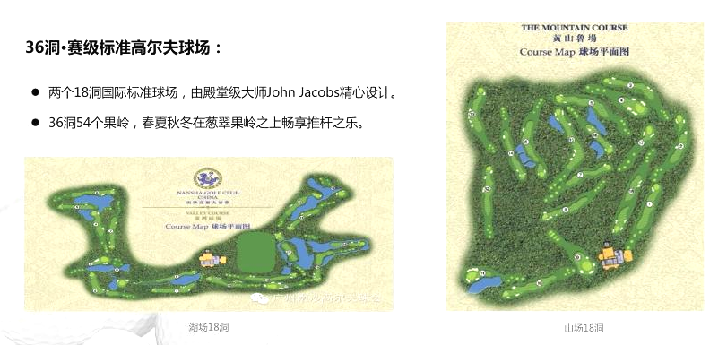 广州南沙高尔夫球会地处穗、港、澳三角的中心,由殿堂级大师庄积及(John Jacobs)设计的两个18洞标准球场,分别为芦湾场及黄山鲁场,标准杆均为72杆,球场依山而建,湖光山色,风光旖旎,球道高低起伏,错落有致,变化多端,趣味无穷。由于地形具有特点,所以球道高低起伏有致,变化多,趣味丰富。球场拥有设备完善的大型练习场,数量充足的练习球道、真草打位、沙坑练习区、果岭练习区、短杆练习区等。