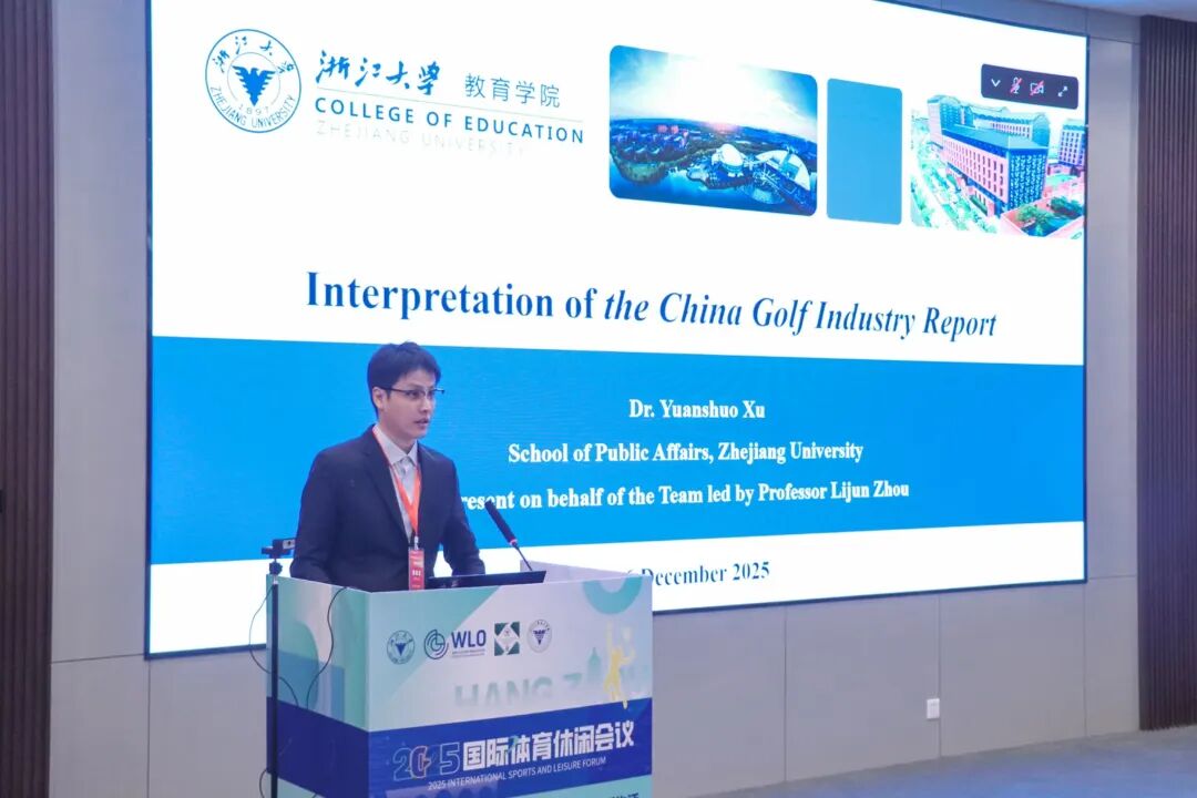 浙江大学“百人计划”研究员徐元朔博士作为浙江大学高尔夫产业课题组主要成员之一,受课题组委托代表团队对《中国高尔夫球运动产业报告(学术版)》进行了系统解读。演讲内容涵盖高尔夫球场地设施、参与人口、赛事培训等核心数据,并从经济、就业、生态等维度深入分析高尔夫球行业价值,同时提出了丰富赛事供给、优化设施配置、创新生态建设模式等对策建议。