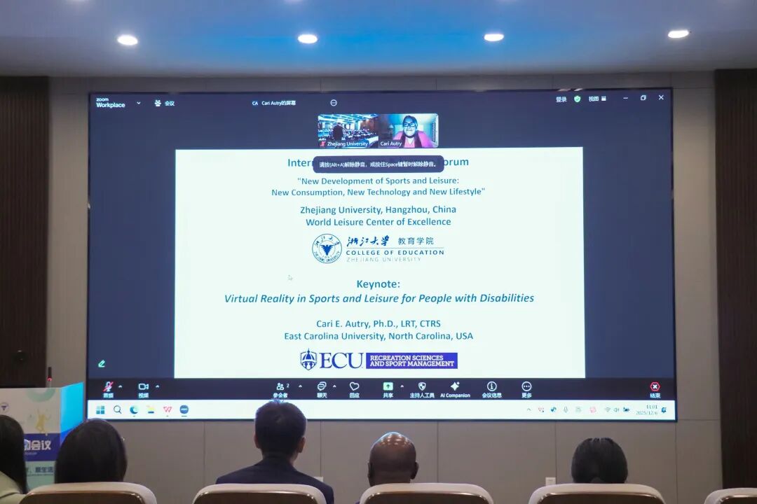 美国东卡罗莱纳大学副教授卡里·奥特里聚焦残疾人体育休闲领域,剖析了残疾人参与体育休闲面临的认知、技能、可达性等多重约束,介绍了虚拟现实(VR)技术的类型及治疗价值,既可作为独立休闲方式,也能助力技能培养并衔接现实场景,还分享了该校虚拟现实帆船模拟与适应性帆船项目的实践成果。