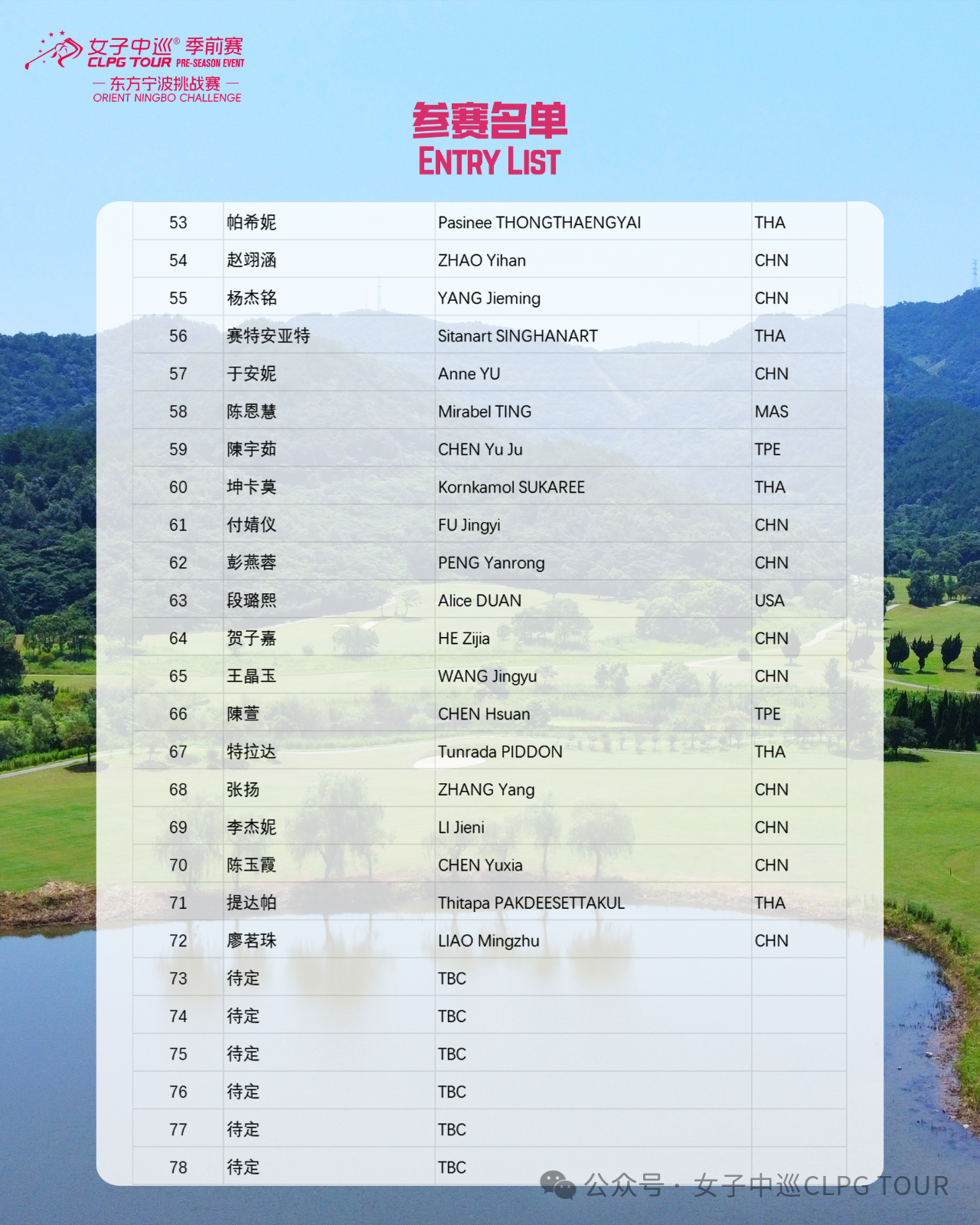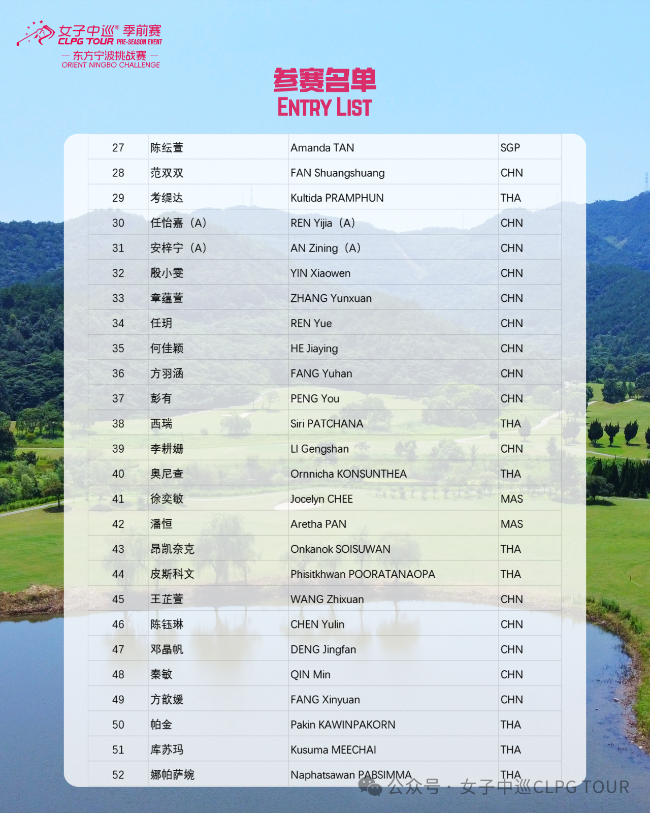 北京时间1月19日至23日,女子中巡即将奔赴宁波,迎来季前赛-东方宁波挑战赛!赛事采用54洞比杆赛赛制,不设晋级线;由78位球员组成的阵容更是充满惊喜!旅美球员、女子中巡三冠王殷小雯,冠军球手章蕴萱;女子中巡2024赛季奖金王、四冠王纪钰爱;2025赛季积分王石昱莉、奖金王王梓萱、三冠王许赢;2026资格考试状元于安妮,前世界业余排名第二的陈恩慧,以及女子中巡新秀、泰国球员坤卡莫等都将出战。实力球员间将碰撞出怎样的火花,一周后答案揭晓!