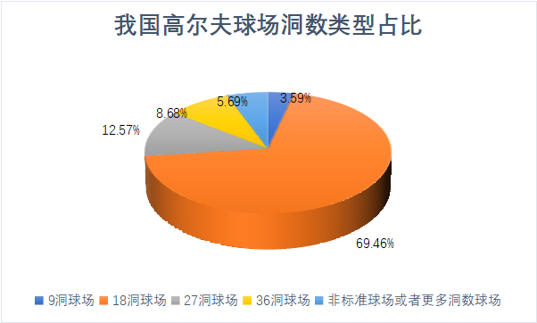 按照球洞数量划分,球场类型分为9洞球场、18洞球场、27洞球场、36洞球场等。据调查统计,我国9洞球场占比3.59%,18洞球场占比69.46%,27洞球场占比12.57%,36洞球场占比8.68%,非标准球场或者更多洞数球场占比5.69%。