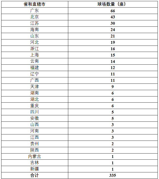 经调查统计,截至2025年6月底,我国现存高尔夫球场422家,其中,已关闭54家,暂停运营和整改中33家,正在营业335家,均在国家发展改革委的清单中。本报告中球场相关数据均按335家统计、测算。我国全国31个省区市均以各种形式开展高尔夫球运动,26个省区市建有高尔夫球场。全国有5个省市高尔夫球场数量超过20座,分别是广东66座、北京43座、江苏30座、海南24座和山东21座。