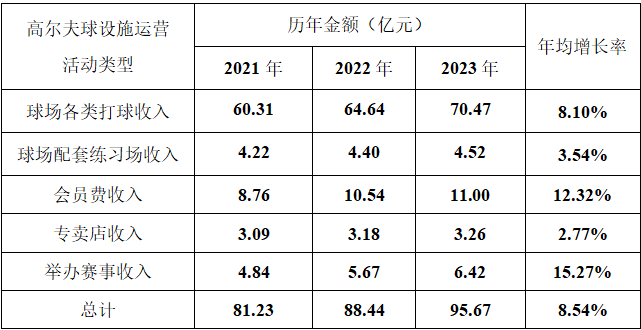 综合球场各类设施运营收入,2023年全国高尔夫球场经营收入总额为109.95亿元2。打球、办赛、专卖店等打球相关收入是球场收入的主要部分,配套设施服务也为球场带来了一定收入。
