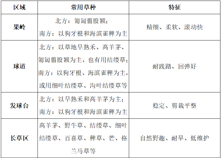 表 13 高尔夫球场草坪区域内常见的分区草种搭配