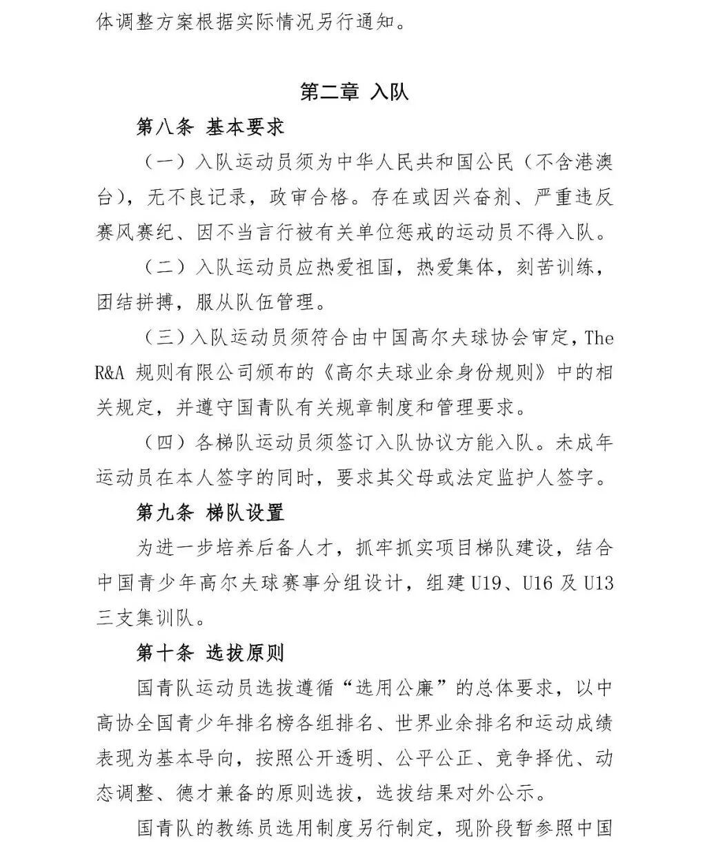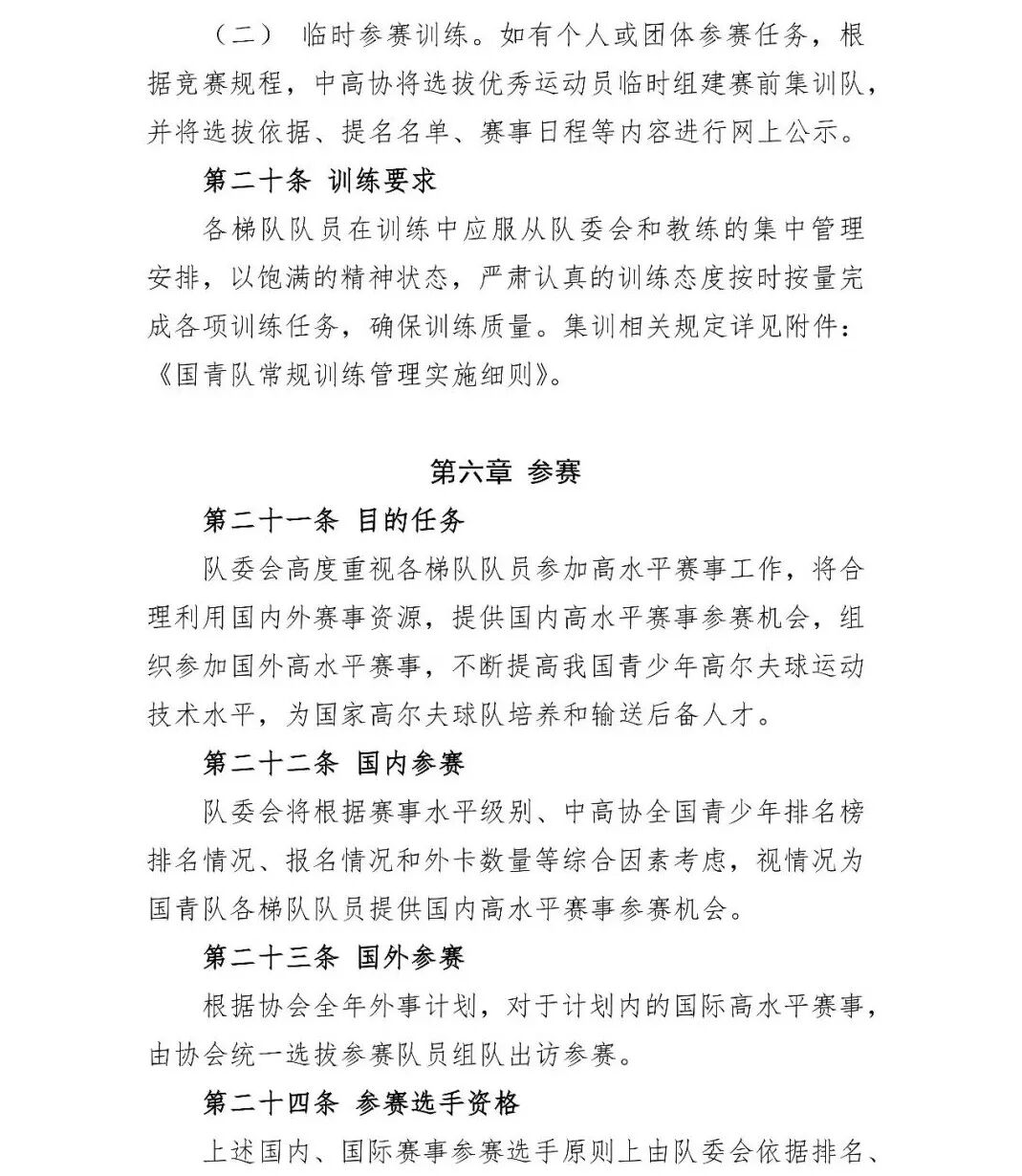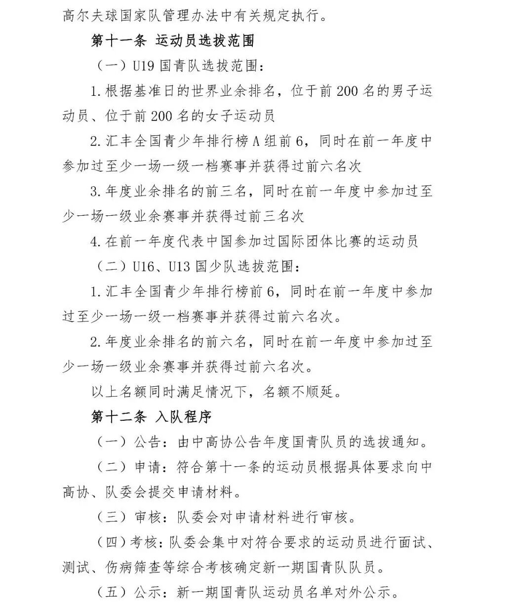 为抓牢抓实高尔夫球项目梯队建设,加强青少年后备人才培养和储备,助力优秀青少年运动员提高个人综合素质,我协会对2024年9月发布的《中国国家青少年高尔夫球队管理办法(试行)》进行了修订,调整了运动员选拔范围和入队程序,修订内容详见附件或参见“阅读原文”。