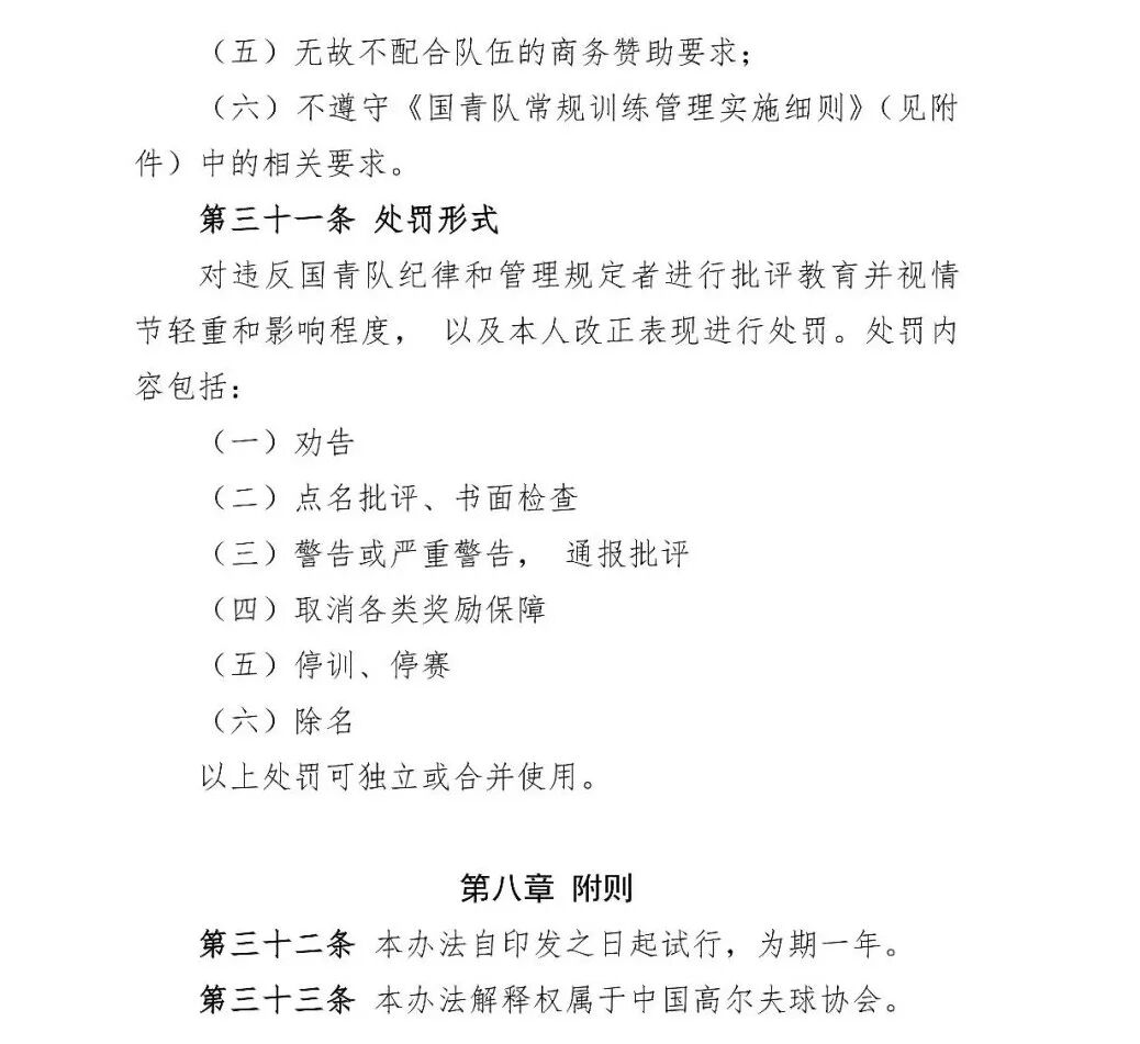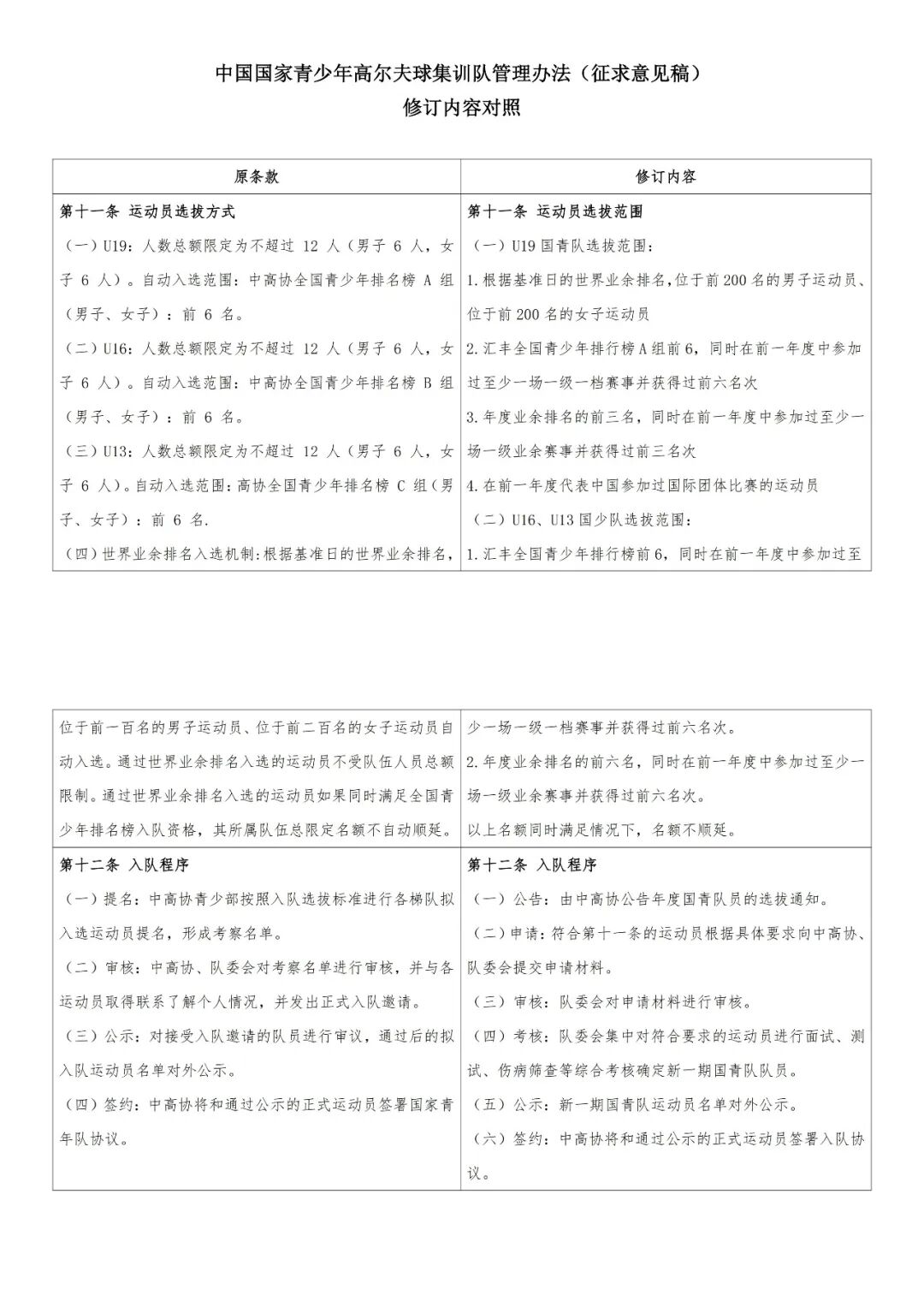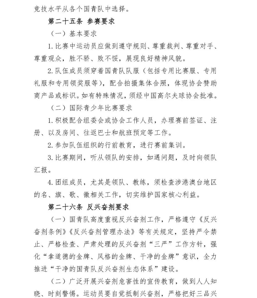 为抓牢抓实高尔夫球项目梯队建设,加强青少年后备人才培养和储备,助力优秀青少年运动员提高个人综合素质,我协会对2024年9月发布的《中国国家青少年高尔夫球队管理办法(试行)》进行了修订,调整了运动员选拔范围和入队程序,修订内容详见附件或参见“阅读原文”。