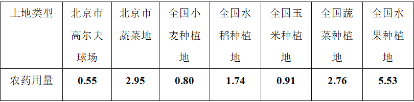 2012年,北京林业大学草坪研究所以北京地区高尔夫球场为研究地对农药施用量进行统计后,与同年北京地区蔬菜地农药施用及同年全国主要农田作物农药施用量进行比较,可以看出高尔夫球场的农药施用量要低于各类农田,即使是农药施用量最低的小麦,高尔夫球场也比小麦农田农药施用量低。