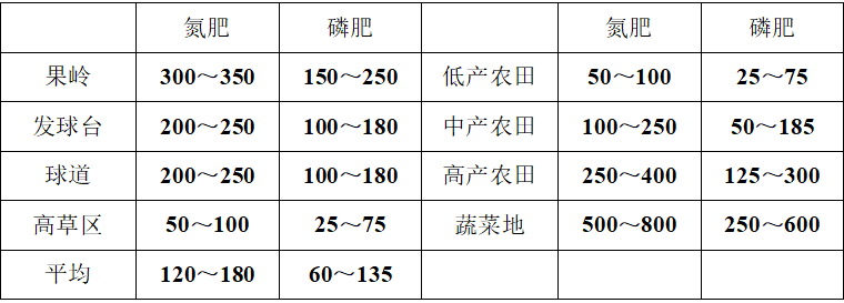 由表可知,高尔夫球场果岭、发球台及球道氮磷施肥量与高产农田相当;高草区与低产农田相当;其他障碍区不施肥。球场整个草坪养护区平均而言,施肥量与中产农田相当。