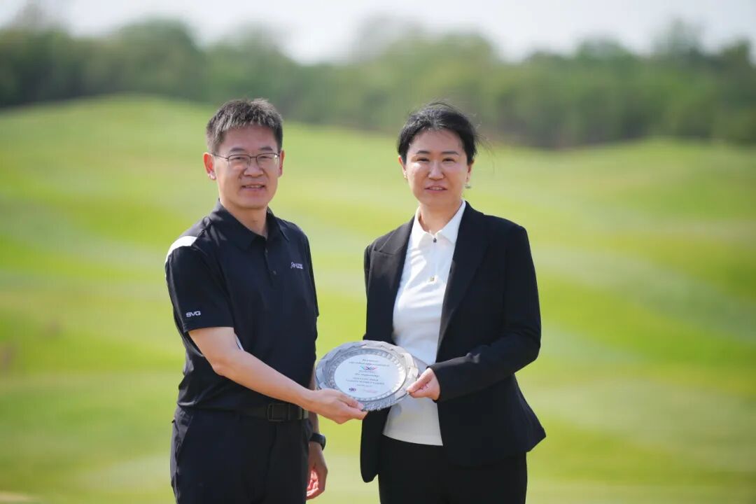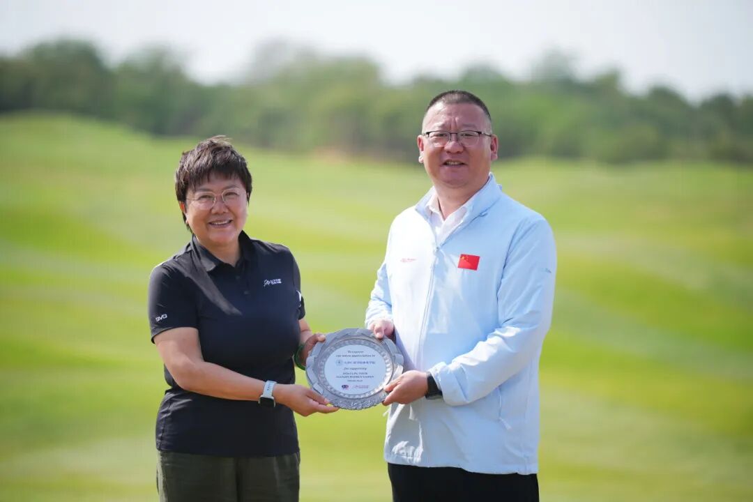 中国高尔夫球协会秘书长韦庆峰(左一),向天津市小球运动管理中心党总支书记、主任李晶赠予感谢盘