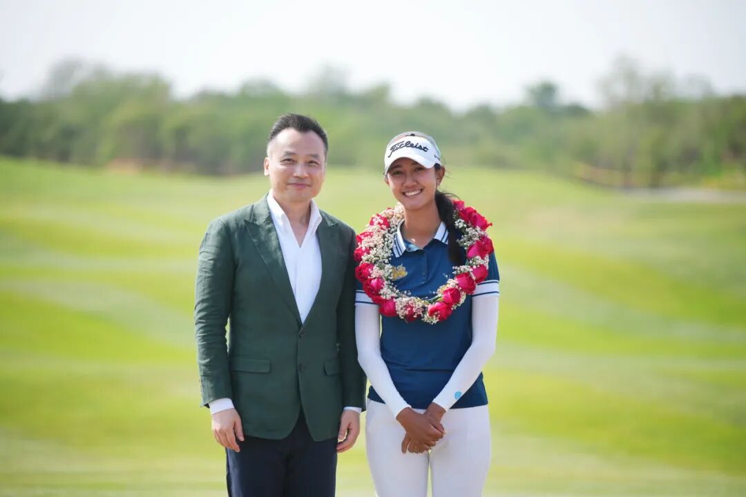 中国高尔夫球协会副主席、中国女子职业高尔夫球巡回赛董事长潘仲光为冠军球员考缇达颁发冠军花环