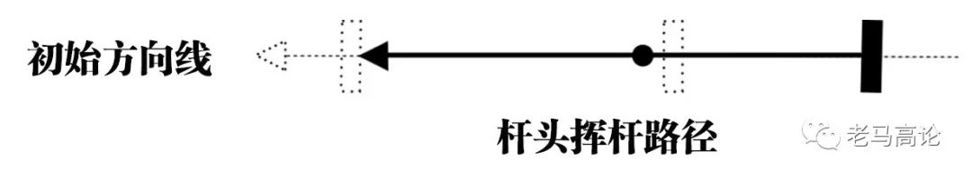 在推杆中,击球瞬间杆面角度(即杆面的指向)和挥杆路径对球滚动的方向均有影响。从目前查到的文献来看,最小的认为杆面角度决定了80%的出球方向,最多认为决定了92%的出球方向。(接下来我们会通过远见高尔夫特制的推杆机器人亲测检验。)无论如何,杆面角度是决定出球方向的主要成因,但是挥杆的路径仍然对球的初始方向产生影响。理论上最完美的情况是,挥杆的路径是一条直线,即挥杆的全程始终位于目标线上。如下图:
