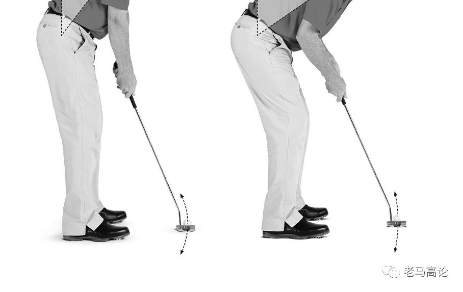 由于人体解刨学结构,推杆姿势上脊柱弯曲越少,(手臂垂直于地面的情况下)挥杆时杆头轨迹就“弯”,脊柱弯曲越多,轨迹就越“直”。
