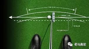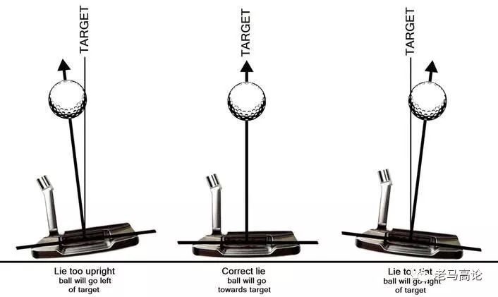 由于推杆杆面一般都有3°-4°的杆面仰角,因此,和铁杆一样,改变推杆的动态杆底角就会改变杆面角度(杆面指向)。简单地说,(右手推杆)将杆身越直立(杆头根部越抬起),杆面就越指向右侧;杆身越平放(杆头趾部越抬起),杆面就越指向左侧。