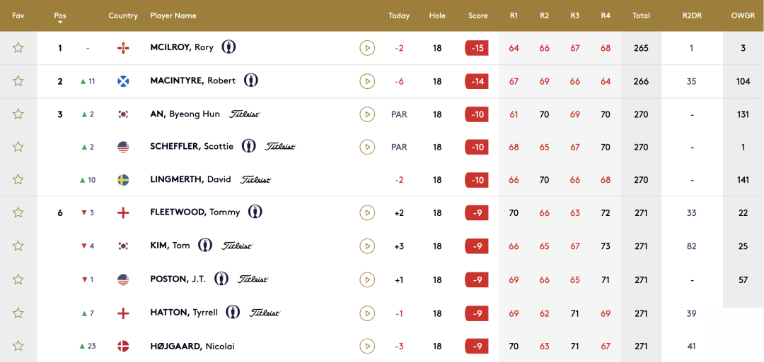 可惜麦克罗伊没有给他这个机会。随着小球缓缓入洞,小麦的总成绩定格在了-15杆。他在最后两洞连续抓鸟,以1杆的优势顺利拿下2023年苏格兰公开赛冠军。