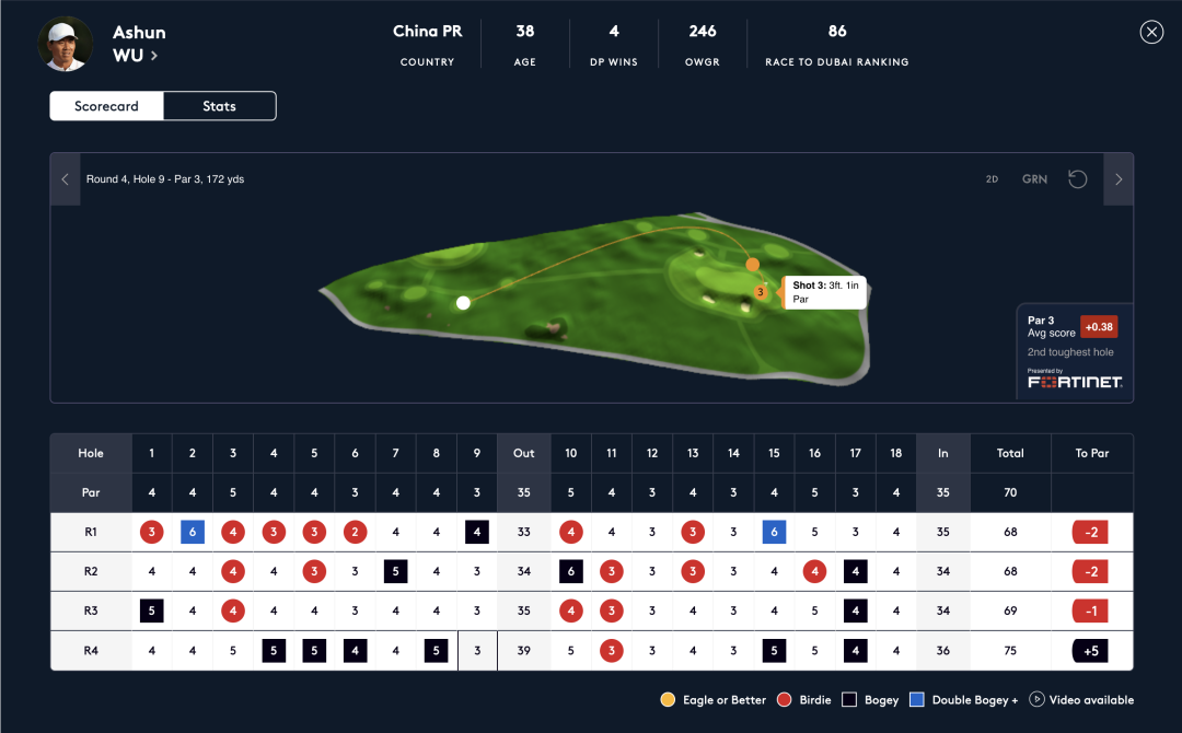 可惜好景不长,这名韩国小将的木杆、推杆和铁杆在上半场最后三洞先后出现问题,连吞3个柏忌,这一串的致命失误使他的排名迅速滑落至T6。