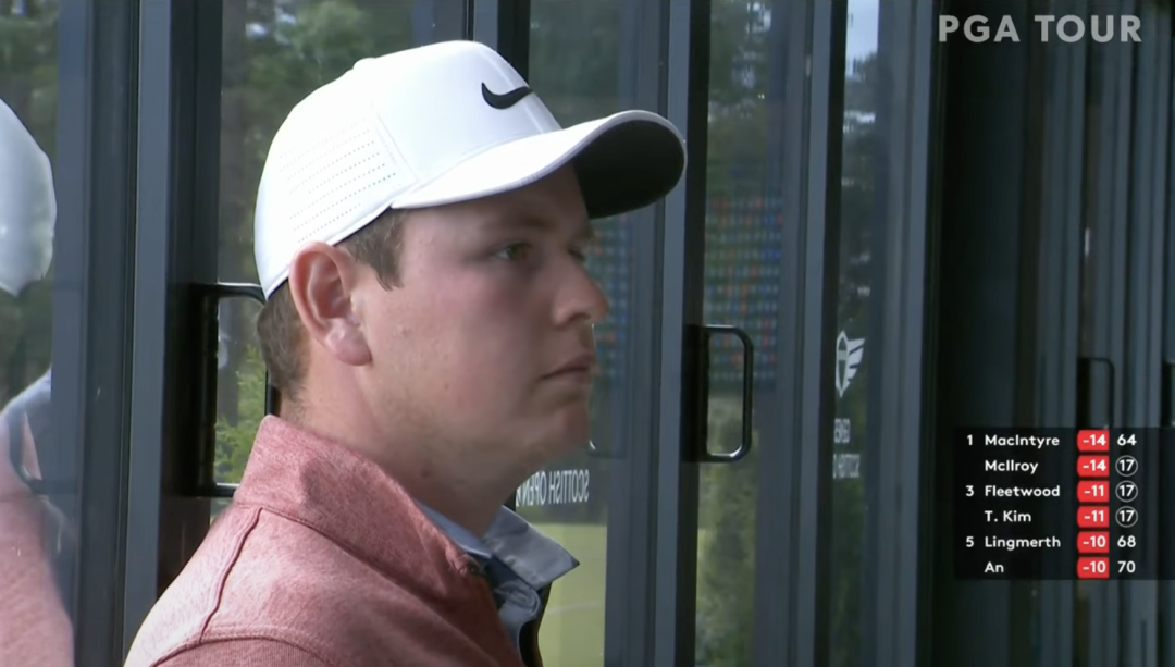 到达18号洞时,麦金泰尔以-13杆的成绩与麦克罗伊并列领先。他在这一洞的开球出现了失误,球滚进了球道左侧的长草。幸运的是球的落点周围长草较为稀疏,在短暂的权衡后麦金泰尔选择冒险直接进攻果岭。他化腐朽为神奇,在顶着左侧横风的恶劣条件下,用球道木直接将球送到了距离球洞仅1码的位置。随后他顶住压力,完成了抓鸟的一推,以1鹰5鸟1柏忌完成了本轮比赛。此时他的总成绩为-14杆,以1杆优势单独领先。