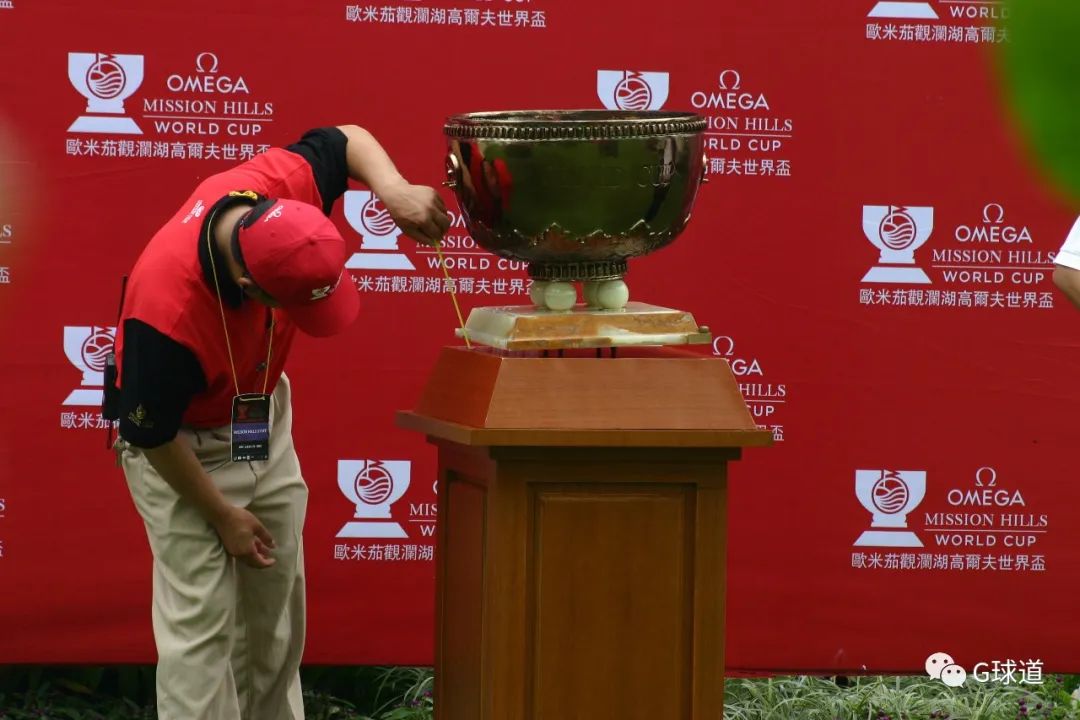 2007年11月25日,观澜湖世界杯颁奖仪式前,一名工作人员在检查奖杯。世界杯在东莞观澜湖举办三届、在海口观澜湖举办一届后,于2011年告别了中国,没有兑现“连续12年在观澜湖球会举办”的合同。