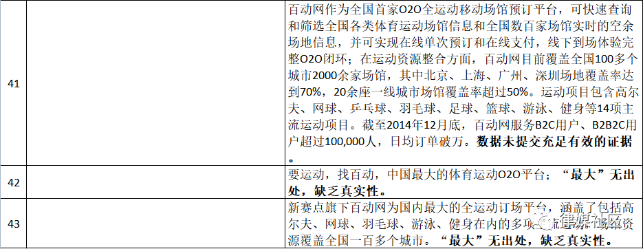 序号2、3、6、7、8、9、14、15、16、17、18、21、22、24、25、26、27、28、29、30、31、34、35、38、92、93、94、95、96、97、100、101、102、104、105、106、108、109、110、111、112、113、114,被告使用“全国最大”“国内最大”“遥遥领先”“中国最大”“唯一”“最专业”“最丰富、最优惠”“最优价”“最低订场价”“连续八年市场占有率第一”“国内首家”“日订单近万”“服务千万用户”“覆盖全国100个多城市”“所有省会城市全覆盖”以及对场馆数量的宣传等表述。关于其中“最大”等绝对含义的词汇或内容的表述,一般来说应有相应的出处或者证据证明其真实性。“遥遥领先”宣传语是指处于相对范围内排名第一的位次,同时在排位领先的基础上,还处于大幅度超过的状态。但被告均未对其所宣传地位的来源以及出处、对其大幅度超过同行业其他竞争主体的客观情况进行有效举证。关于服务内容和数量的宣传,直接指向其服务质量和服务内容,会直接影响消费者判断,但被告均未提交充足有效的证据对其宣传内容进行举证,应承担举证不利的后果。且上述宣传很有可能不正当提升被告自身的市场竞争优势,从而使被告获得更多的交易机会,并在一定程度上损害其他同行业竞争者的利益,特别是与其具有重叠市场竞争利益的三原告的利益,破坏公平的市场竞争秩序,构成虚假宣传。因并无证据原告在被告发布文章时即已经知晓相关内容存在,且三原告本案中提交的公证书时间距离起诉时间均未超过诉讼时效,故被告关于上述微信公众号文章已过诉讼时效的抗辩本院不予采信。