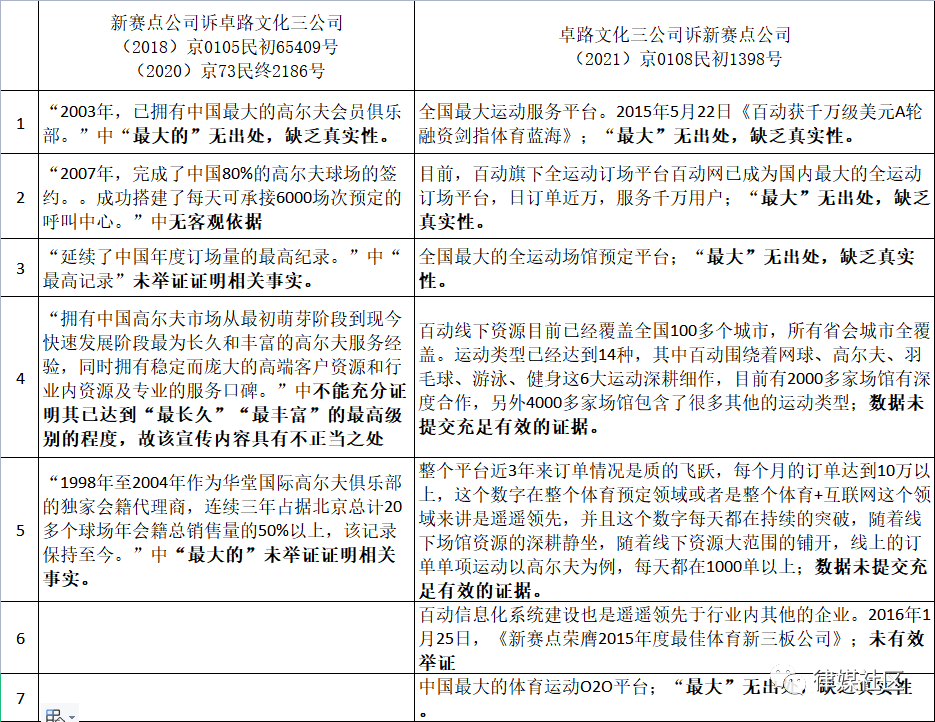 然而,到了2021年,卓路文化三公司又以虚假宣传纠纷将新赛点公司起诉至北京市海淀区人民法院。它们诉称自2013年开始新赛点公司以通过侵害卓路文化三公司商业秘密的方式进入高尔夫中介服务行业。2019年5月,卓路文化三公司发现,新赛点所经营的网站及公众号上发布有大量虚假宣传信息,在公开转让说明书、投标文件中有虚假宣传行为,被告的法定代表人在媒体上也进行了虚假宣传。在诉讼中,卓路文化三公司列举了新赛点包括所经营的网站、公众号、以及招标文件中共计114项涉及虚假宣传的行为。最后,法院认定在卓路文化三公司罗列的有43项宣传行为可能不正当提升被告自身的市场竞争优势,从而使被告获得更多的交易机会,并在一定程度上损害其他同行业竞争者的利益,特别是与其具有重叠市场竞争利益的三原告的利益,破坏公平的市场竞争秩序,构成虚假宣传,认定新赛点公司构成虚假宣传的不正当竞争行为。