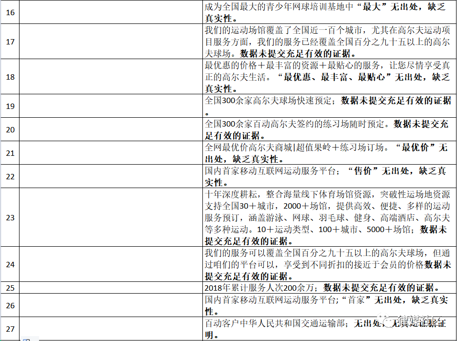中国高尔夫网中发布有涉案19条内容。其中,被诉为使用绝对化用语“最早”“唯一”“最受推崇”“最大”“最高”“最为长久和丰富”“顶级”“最佳”的共11条,包括:序号1.“中国高尔夫网是中国最早成立的高尔夫增值服务提供商之一”;序号2.“成立至今,已经发展成为国内唯一一家同时拥有平面和网络媒体平台,并具有多年高尔夫市场推广经验和稳定而大量高端客户资源的专业高尔夫增值服务企业”;序号3.“中国高尔夫网是国内最受推崇的高尔夫增值服务品牌”;序号5.“中国高尔夫网成为国内唯一能与高端高尔夫球场独家签约公司”;序号8.“2003年,已拥有中国最大的高尔夫会员俱乐部”;序号10.“延续了中国年度订场量的最高纪录”;序号11.“拥有中国高尔夫市场从最初萌芽阶段到现今快速发展阶段最为长久和丰富的高尔夫服务经验,同时拥有稳定而庞大的高端客户资源和行业内资源及专业的服务口碑”;序号14.“大卫·利百特,世界知名的顶级教练,教过的知名弟子包括顶级球员尼克·费度、恩尼·艾斯、朴世莉、魏圣美,美国《高尔夫文摘》评出的世界顶级教练排名第二”;序号15.“迈克·亚当斯,2007年位列高尔夫文摘评出的100名顶级教练”;序号17.“吉姆·迈克林,位列美国《高尔夫文摘》评选的世界五位顶级教练之一”;序号18.“瑞克·史密斯,位列美国《高尔夫文摘》评选的世界五位顶级教练之一”;序号19.“盖瑞·瓦尔林,1986年当选美国PGA‘年度最佳教练’”。被诉使用了数据、统计资料但未表明出处的有7条,包括:序号3.“中国高尔夫网的有效注册用户超过10万人,根据ALEXA统计数据,日均IP访问量1.8万,日均PageView浏览量30万”;序号4.“《21G0LF财智》杂志是国内第一本以高尔夫为主的DM杂志”;序号5.“至今为止,中国高尔夫网已经在全球拥有签约球场200余家,并与北京龙熙温泉高尔夫俱乐部、华堂国际高尔夫俱乐部、鸿禧国际高尔夫俱乐部、北京万柳高尔夫国际俱乐部等4家知名球场签订了独家订场服务协议”;序号6.“目前,已拥有VIP会员20000余名;序号9.“2007年,完成了中国80%的高尔夫球场的签约。成功搭建了每天可承接6000场次预定的呼叫中心”;序号12.“1998年至2004年作为华堂国际高尔夫俱乐部的独家会籍代理商,连续三年占据北京总计20多个球场年会籍总销售量的50%以上,该记录保持至今”;序号13.“良好的信用使80%的预定业务实现了‘代收代付’”。