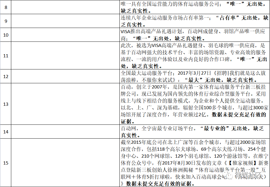 三原告主张2015年9月,在被告的公开转让说明书中也存在虚假宣传行为,具体包括:39.公司旗下主打的“百动”品牌已在国内体育服务领域中树立了良好的品牌形象,市场知名度、认可度较高。近年来,公司凭借自身完善的客户服务体系、优质的客户服务能力以及丰富的行业服务成功经验,结合“互联网+”、“O2O”等先进的运营模式,正逐步成为中国体育服务领域的创新者和领跑者;40.2014年全运动场馆预订服务量共计29.07万次,呼入电话总量为16.41万次,整体投诉率小于1%,电话预订成功率达到95%。41.为了更好地服务于银行客户,公司2015年通过技术攻关实现了双方系统平台的对接,即按照银行客服平台传输标准,实现银行预订系统与百动预订平台之间传输和统一管理,每日数据实时传输,优化预订处理流程,减少时间成本、人力成本、坐席成本,从而为客户提供快捷、安全、优质的场馆预订服务。42.高性能场馆搜索技术-国内同行业领先;百动异步任务系统-国内同行业领先;百动交易保障系统-国内同行业领先;百动Web前端框架-国内同行业领先;43.近年来,公司尤为注重通过技术研发实现业务战略转型,现已通过自主研发形成了“高性能场馆搜索技术”、“百动异步任务系统”、“百动交易保障系统”、“百动Web前端框架”等多项国内行业领先的核心技术。44.公司业务产业链完整,与上下游均保持了良好的合作关系,公司拥有丰富的线下场馆资源,与国内2000余家运动场馆开展深度合作。为佐证其上述观点,三原告提交中国网客户端《个人信息泄露之金融APP信息安全白皮书发布》2016年9月18日以及新赛点公司漏洞信息截屏,其中称“通过新赛点泄露的内部管理系统无需密码和账号就能看到用户姓名、身份证号、电话、银行卡信息,涉及的银行包括中国银行的美运卡、无限卡;广发银行的私人银行、信用卡;民生的钻石卡等等。”“据了解,此次漏洞已导致两万多个用户信息泄露在互联网上,在这样的情况下厂商竟还视而不见。当网友联系到厂商的时候,得到的回应确是系统老旧,无人维护。这样的理由都可以搬上台面来说,对比,笔者也不知道如何对这家已经在新三板上市的公司进行评价”。