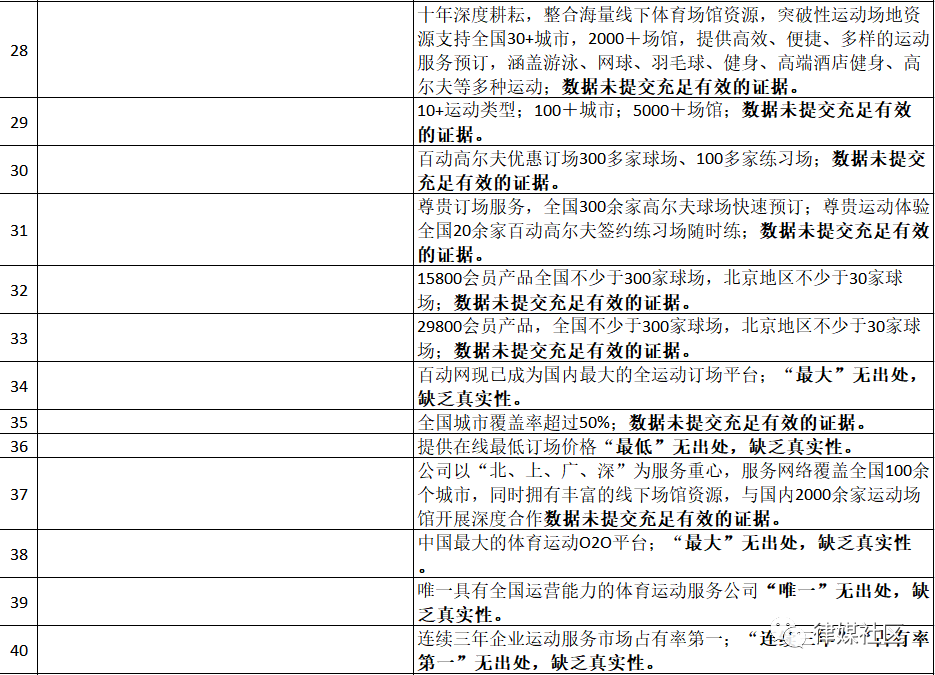 三原告主张被告在其微信公众号、网站、app中存在虚假宣传行为(具体内容本院下文依次标号),为此提交(2020)京方圆内经证字第00844号公证书,证实2020年1月17日,原告委托代理人在公证处进行了保全证据公证,公证书中载明:“百动网”公众号(baidongapp)2017年1月24日的文章《用平民价格优享高贵运动,优享高尔夫,从百动开始!》称:1.高贵的运动,平民的价格,优享高尔夫,不二之选!2.全国最大运动服务平台。2015年5月22日《百动获千万级美元A轮融资剑指体育蓝海》;3.目前,百动旗下全运动订场平台百动网已成为国内最大的全运动订场平台,日订单近万,服务千万用户;4.百动网的出现,实时整合了场馆资源,一举改变了订场难、信息混乱的全民运动健身市场现状。2015年7月22日《【体银汇沙龙】获千万级美元A轮融资的百动—互联网+体育模式》;5.百动公司涉足体育始于2002年;6.全国最大的全运动场馆预定平台;7.百动线下资源目前已经覆盖全国100多个城市,所有省会城市全覆盖。运动类型已经达到14种,其中百动围绕着网球、高尔夫、羽毛球、游泳、健身这6大运动深耕细作,目前有2000多家场馆有深度合作,另外4000多家场馆包含了很多其他的运动类型;8.整个平台近3年来订单情况是质的飞跃,每个月的订单达到10万以上,这个数字在整个体育预定领域或者是整个体育+互联网这个领域来讲是遥遥领先,并且这个数字每天都在持续的突破,随着线下场馆资源的深耕静坐,随着线下资源大范围的铺开,线上的订单单项运动以高尔夫为例,每天都在1000单以上;9.百动信息化系统建设也是遥遥领先于行业内其他的企业。2016年1月25日,《新赛点荣膺2015年度最佳体育新三板公司》;10.2015年4月新赛点获得王亚伟千合资本、朱雀投资6000万元人民币投资,并于11月正式登陆新三板,成为国内体育运动服务平台第一股;11.在资源拓展层面,新赛点广接入12家银行平台,对接包括全国总工会在内的全国20+行业体育协会等资源。2015年12月17日《创造历史,我们不只是梦想家》:12.新赛点已经成为新型的技术驱动的移动互联网体育运动服务公司;13.首家体育运动服务新三板挂牌公司;14.中国最大的体育运动O2O平台;15.唯一具有全国运营能力的体育运动服务公司;16.连续八年企业运动服务市场占有率第一;2016年1月29日《VISA推出高端产品礼遇计划,百动网成健身、羽馆产品唯一供应商》:17.VISA推出高端产品礼遇计划,百动网成健身、羽馆产品唯一供应商;18.此次,被选为VISA高端产品礼遇健身、羽毛球的唯一供应商,是基于百动网强大的技术平台、丰富的场馆资源、专业高效的服务流程、一流的用户体验以及业内良好的合作口碑。19.百动网作为高端场馆资源的优质供应商,汇集了全国100+城市的场地资源,已成为国内少有的高端体育场馆资源方。2017年2月13日《五星酒店不超过400元,情人节首选“百动”》:20.五星酒店不超过400元!情人节首选“百动”;21.全国最大运动服务平台;2017年3月27日《招聘|我们就是这么放荡浪棒,不服你来试试》:22.百动,创立于2007年,是国内第一家体育运动服务平台新三板挂牌公司。现已发展为国内领先的体育行业综合型服务平台。采用线上与线下相结合的服务模式,为企业和个人提供全运动服务。以北、上、广、深为基础,辐射全国100多个城市,与超过3000家场馆开展了深度合作,年营业额过2亿。23.国内领先的体育运动服务互联网平台。2015年8月6日《【揭秘】为什么Uber不能进军运动行业平台》:24.百动网,全宇宙最专业订场平台。三原告主张相关内容被其他媒体转载,在六合咨询公众号中,有2016年7月17日发布的文章《新赛点(834425.oc)-国内专业体育运动服务平台,以“百动+”打造体育产业生态》,其中称:25.截至2015年底公司在北上广深等百余个城市,与超过2000家场馆深度合作,包括118个高尔夫球场、69个高尔夫练习场、254个健身中心、210个网球馆、129个羽毛球馆、120个游泳馆等。在维宁体育公众号中,有2017年8月30日发布的文章《【独家视频】新赛点登陆新三板创始人徐林洲揭秘“体育运动服务平台第一股”互联网+体育5折打球啦,快来加入百动高球会吧!(百动高尔夫)》,其中称:26.成为全国最大的青少年网球培训基地;27.我们的运动场馆覆盖了全国近一百个城市,尤其在高尔夫运动项目服务方面,我们的服务已经覆盖全国百分之九十五以上的高尔夫球场。28.最优惠的价格+最丰富的资源+最贴心的服务,让您尽情享受真正的高尔夫生活。29.全国300余家高尔夫球场快速预定;30.全国300余家百动高尔夫签约的练习场随时预定。31.全网最优价高尔夫商城|超值果岭+练习场订场。2017年4月6日在“百动高尔夫”中发布的《一条不敢让高尔夫球场看到的低价订场广告》,称:32.惊喜优惠的球场价格,覆盖全国高品质球场,一卡在手,打遍全国。百动app的介绍中称:33.限时特惠;34.国内首家移动互联网运动服务平台;35.十年深度耕耘,整合海量线下体育场馆资源,突破性运场地资源支持全国30+城市,2000+场馆,提供高效、便捷、多样的运动服务预订,涵盖游泳、网球、羽毛球、健身、高端酒店、高尔夫等多种运动。10+运动类型、100+城市、5000+场馆;36.百动商城9大产品、9000余种商品。针对不同类型商品及购买人群特点采用独立页面优化设置,以方便用户快速查找所需商品。根据不同商品定期进行营销及活动促销。保持物美价深