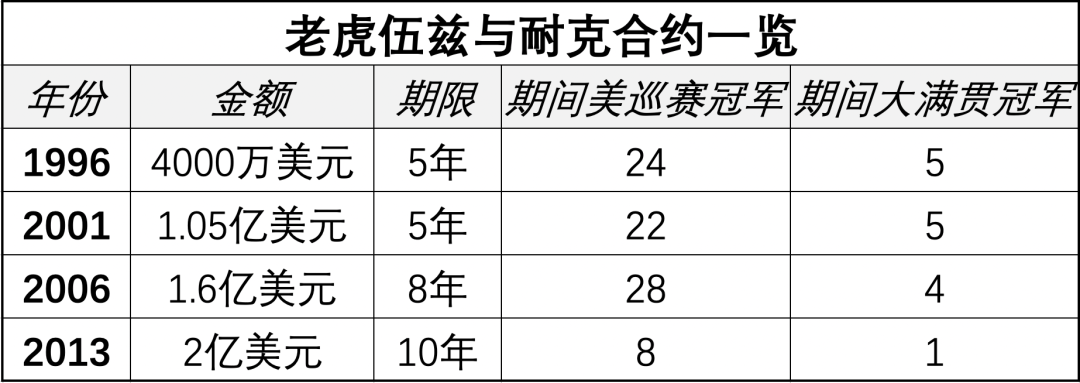 新千年一开始,伍兹便以2000美国公开赛-英国公开赛-PGA锦标赛-2001美国大师赛4连胜,完成了史诗般的“老虎全满贯”,全世界也不再有人敢怀疑这位超新星的实力。也就在2001年,25岁的伍兹与耐克续约5年,合同金额暴涨至1.05亿美元,这使他成为体育史上单笔赞助金额最高的运动员。