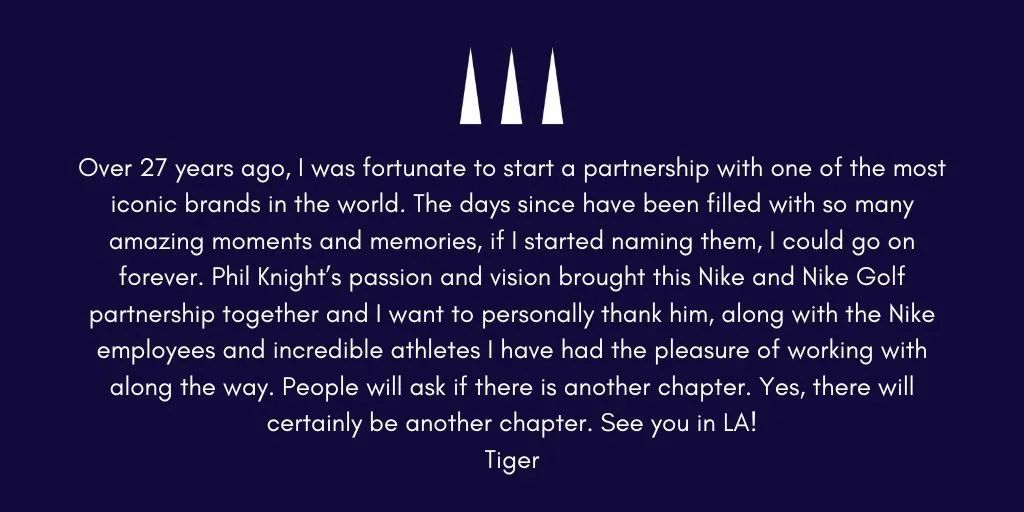 “二十七年前,我很幸运能与世界上最具标志性的品牌建立伙伴关系。自我们合作起,充满许多令人惊叹的时刻与回忆,如果一一道来,我可以一直不停地讲下去。”在社交媒体X的公告中,老虎·伍兹深情写道。