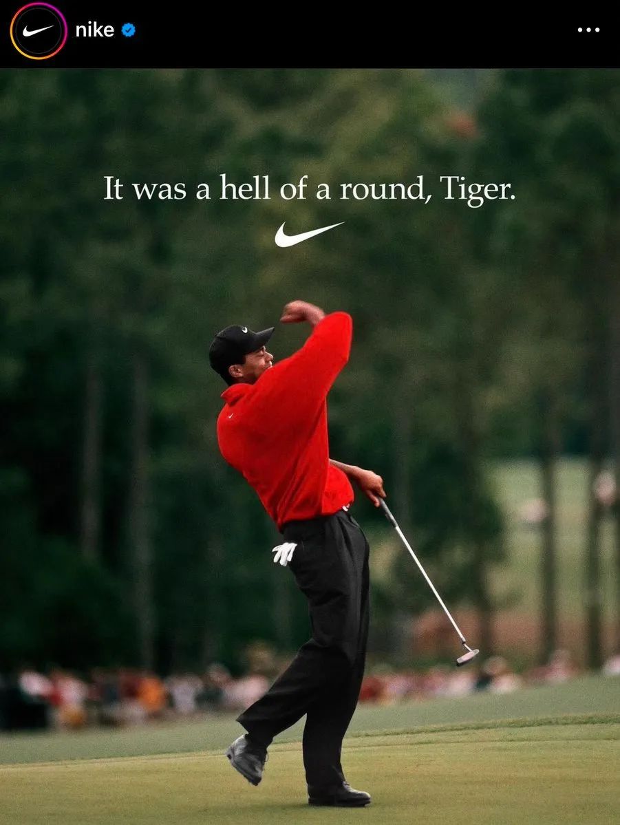 几乎是同一时刻,耐克官方也在Instagram发帖,向合作了1/4世纪的老虎致敬。耐克特意选用了一张1997年,21岁的老虎身着耐克标志性的“周日红”,第一次问鼎美国大师赛时的经典照片。配上言简意赅、却又一语双关的图说:“这是多么精采的一轮,老虎。”