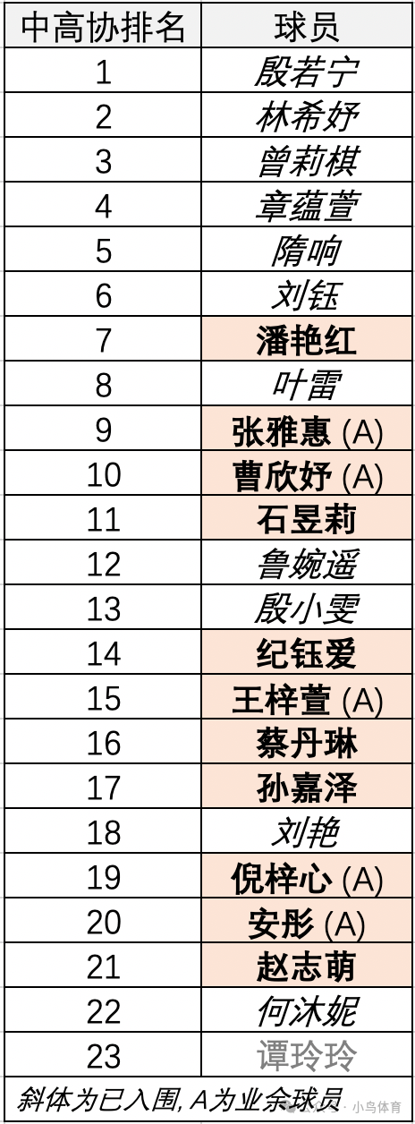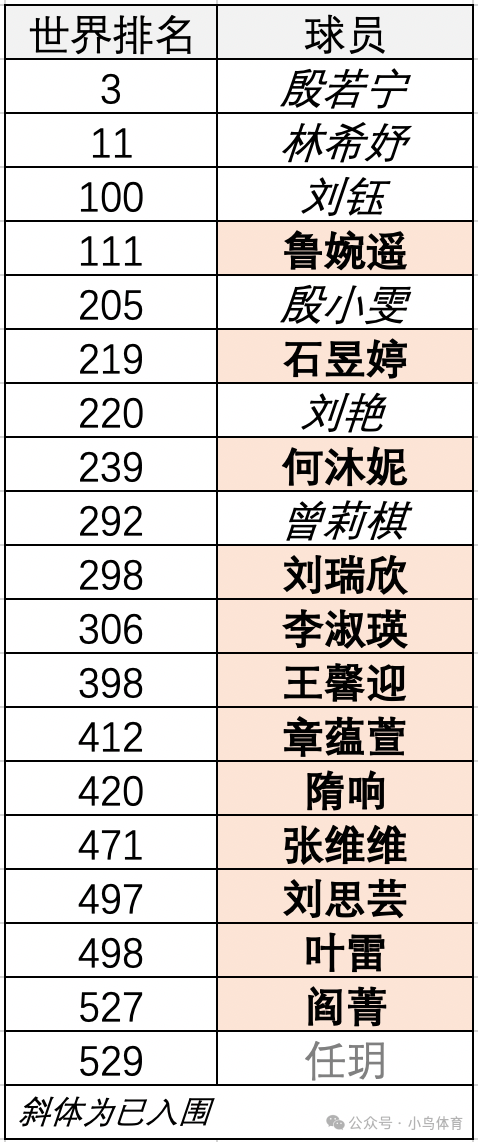 首先看公告第一条,即尚未入选的、女子世界排名靠前的12名中国球员。如果按照最新一期世界排名,情形将会如下: