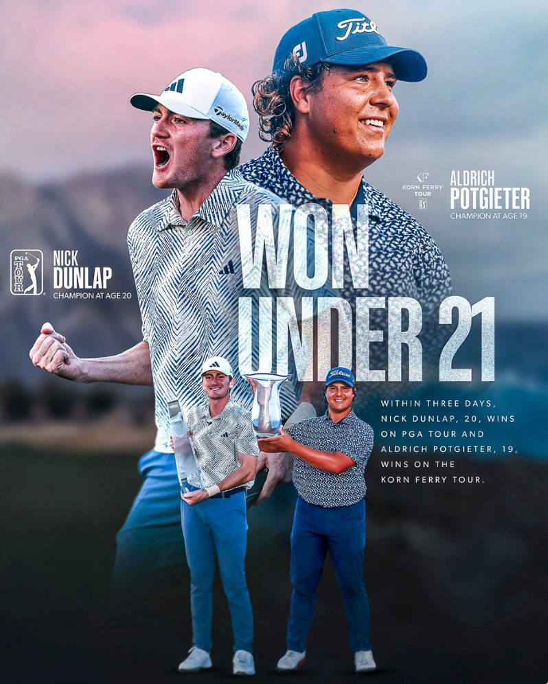 而就在两周之前,美巡赛和光辉国际巡回赛同时上演“青春之歌”——先是1月21日,年仅20岁、以外卡出战的世界业余球王尼克·邓拉普 (Nick Dunlap) ,在美国运通赛上一飞冲天,成为自1991年的菲尔·米克尔森以来,近三十三年首位、也是史上第8位赢得美巡赛的业余冠军。