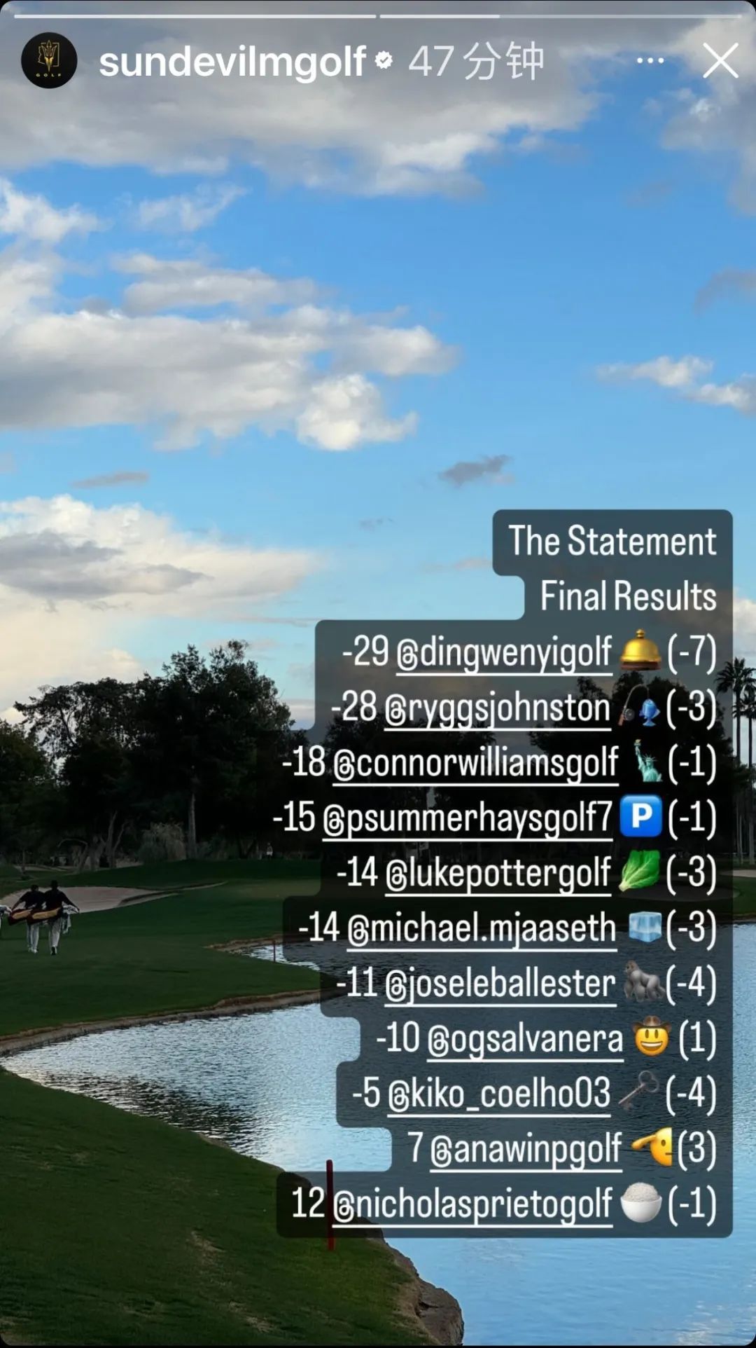 在这场类似莱德杯赛制的两日对抗赛中,丁文一取得了1胜2负的战绩,最终帮助亚利桑那州立大学获得第3名。而仅仅不到一周之后,他便迅速进入顶流状态,在高强度的队内选拔赛中拔得了头筹。NCAA的大门已经在北京少年面前徐徐展开。我们有理由期待,有路德维格·艾伯格、尼克·邓拉普等“大学生美巡冠军”的珠玉在前,来自于中国的“丁丁”,会在更广阔的天空冉冉升起,在大洋彼岸的高坛发出愈发响亮的声音。◈