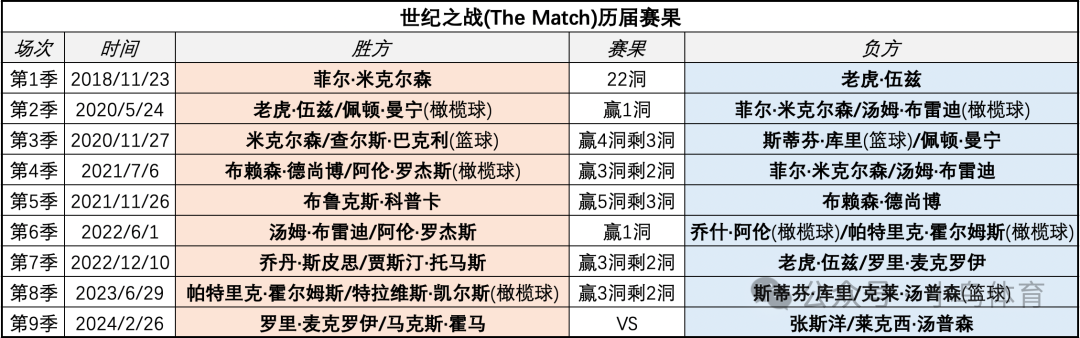 “世纪之战”可以视作高尔夫界的一场“神仙打架”。以全美直播+慈善募捐的卖点,每一场都会吸引顶级流量球星,进行一场任何巡回赛上都无法见到的“梦幻PK”。2018年第一届“世纪之战”,即是老虎·伍兹与菲尔·米克尔森的天王山对决,一举轰动全美。之后邀请范围更是扩大到库里、巴克利、汤姆·布雷迪等NBA、NFL球星,变成了“各界高粉儿”均可参与其中的一场“关公战秦琼”群英会。
