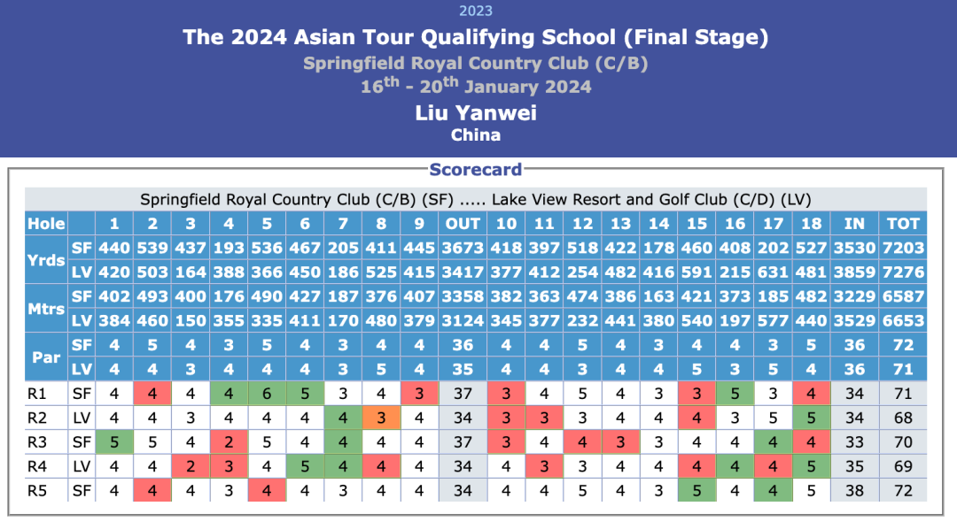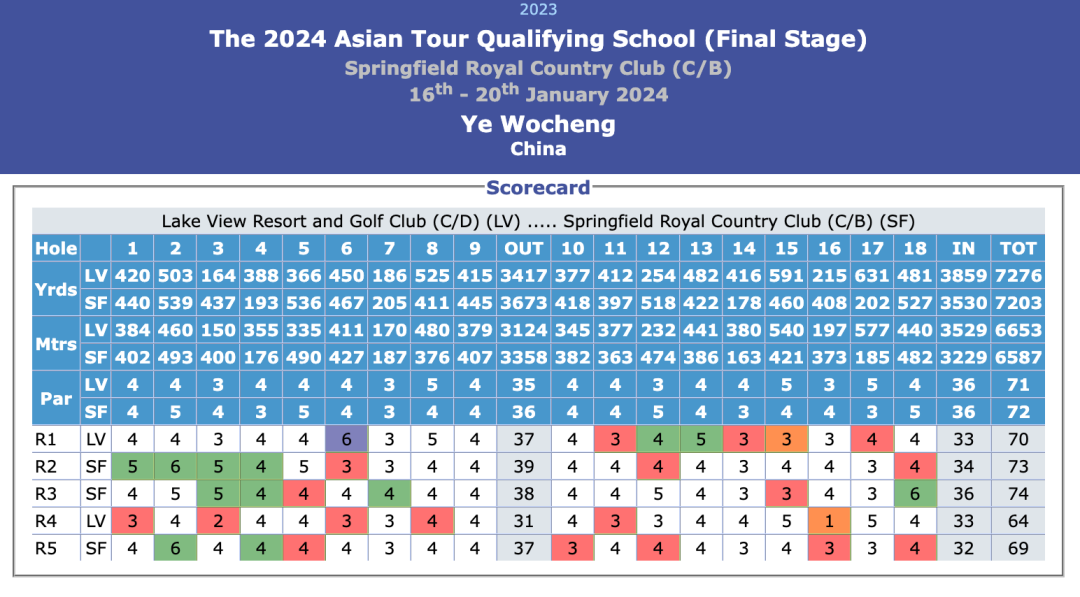 由于亚巡资格考试不存在排名并列,总成绩相同的球员,依次比照“最后36洞-18洞-9洞-6洞-3洞”的成绩,决出名次顺位。因此,叶沃诚最终排名-8成绩6人最好的第26位,刘晏玮排名第31位,两人都将获得2024年亚巡赛“类别16”的会员资格。有望参加所有100万美元级的亚巡独立认证赛事,并有可能排进200万级的亚巡“顶流级别”的国际系列赛 (International Series) 。