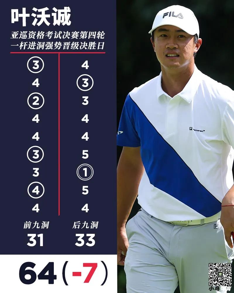 相比起一年前第5名的高排位过关,叶沃诚今年考试开局并不理想,三轮之后仅位列第94位。不过第四轮比赛,东莞小子大发神威,不仅打出低于标准杆7杆的64杆佳绩,还在皇家春田湖景球场 (Lake View) 的16号洞,轰出本届资格考试全场唯一的一记一杆进洞!一举跃居第35名的安全线内。而在今天的决赛轮比赛中,全场第一组出发的叶沃诚更是前九洞就打出4只小鸟的32杆,最终以69杆 (-3) ,总成绩-8,跃过-6的晋35强级线,成功“续卡”亚巡会员资格。