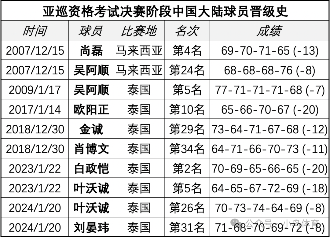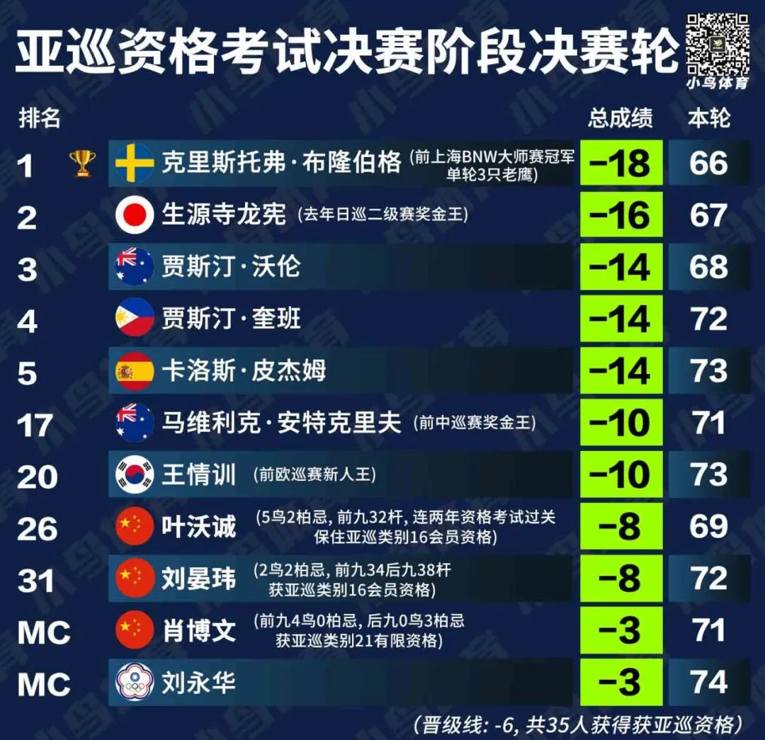 其中,23岁的叶沃诚是连续第二年通过资格学校考验;26岁的刘晏玮则成为了继尚磊、吴阿顺、欧阳正、金诚、肖博文、白政恺、叶沃诚之后,亚巡资格考试有史以来第8位闯关成功的中国大陆球员。