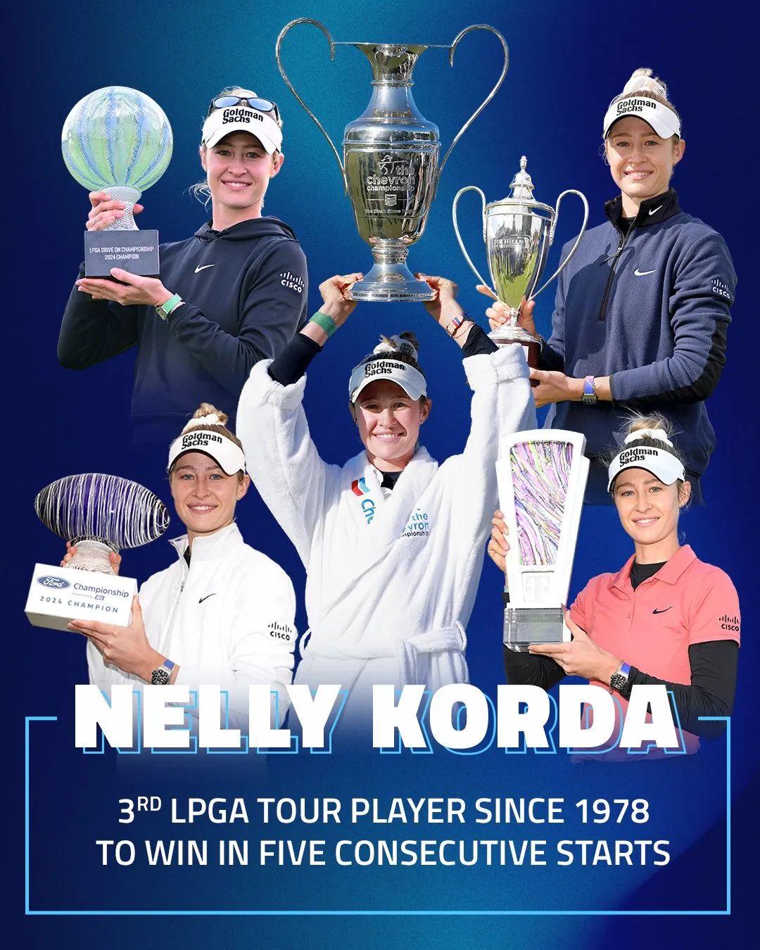 LPGA5连胜,这是什么概念?要知道,从2023年1月至今,中国、日本、泰国三国的姑娘们,总共只赢了5座美巡赛冠军。而在LPGA历史上,只有1978年的南茜·洛佩兹 (Nancy Lopez),以及2004-05年的瑞典传奇天后安妮卡·索伦斯坦 (Annika Sorenstam) 两人,曾完成过五连胜的霸业。