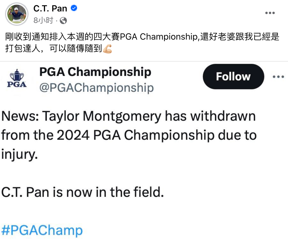 “刚收到通知排入本周的四大赛PGA锦标赛,还好老婆跟我已经是打包达人,可以随传随到。”得知入围大满贯,潘政琮在社交媒体上相当开心。