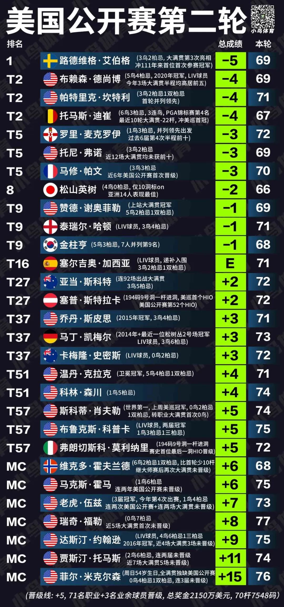然而在接下来的PGA锦标赛上,同样首次参赛的艾伯格却遭遇到了人生第一场大满贯半程出局。不过在仅仅4周过后,24岁的他就又在人生最大的舞台上爆发:依靠首轮66杆,以及今晨69杆的稳健表现,北欧新秀总成绩-5,一举登上了第124届美国公开赛的半程单独领先!