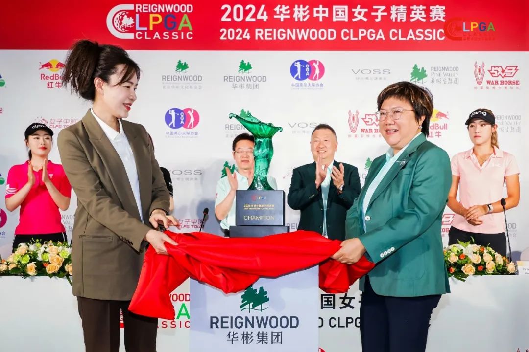 在发布会上,华彬集团执行总裁卢战女士与中高协女子职业赛事部部长、女子中巡董事总经理李红首先揭幕了全新的“绿色女神杯”。这座充满艺术感的奖杯延续华彬LPGA精英赛冠军奖杯的琉璃质感,巧妙地融合女子球员的挥杆形态,将力量与优雅完美结合。
