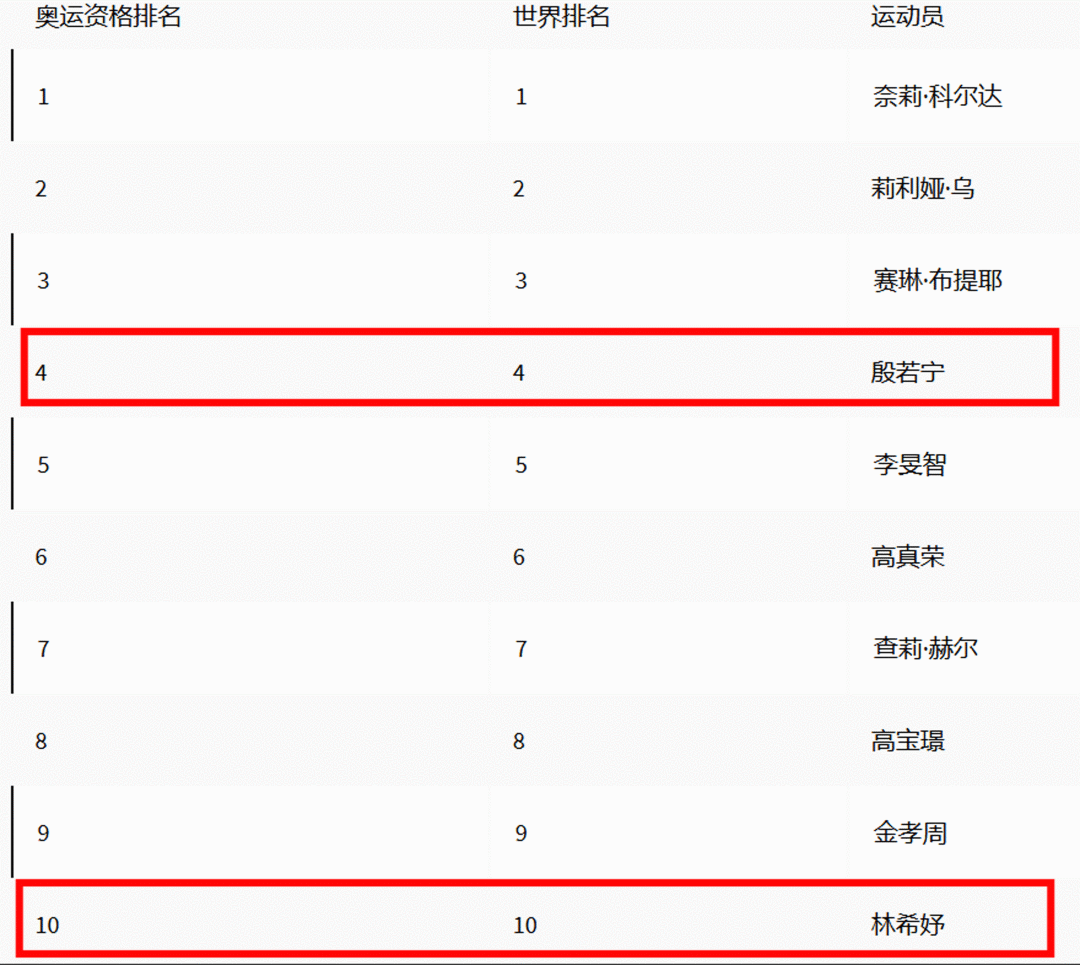 在中国,女子方面,殷若宁、林希妤以世界排名第4及第10直接获得参赛资格。