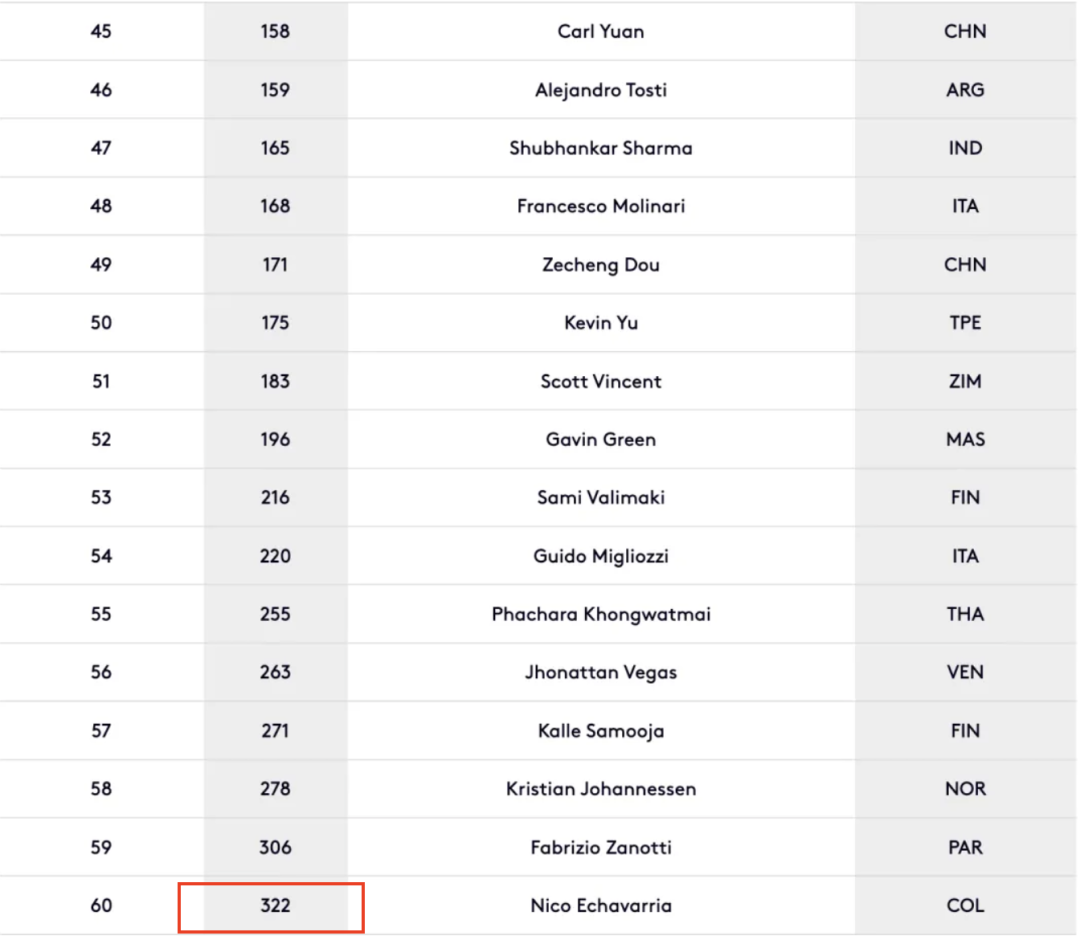 奥运资格排名根据球员平均分排名,其计算方式是运动员在两年资格期内获得的总积分除以参加的比赛数量。