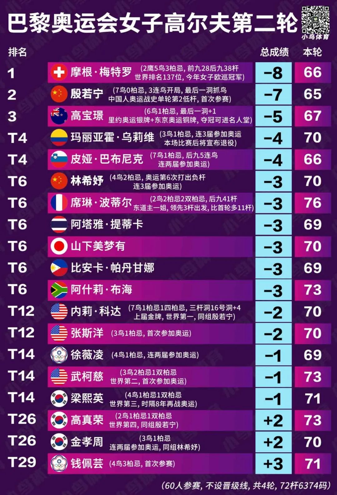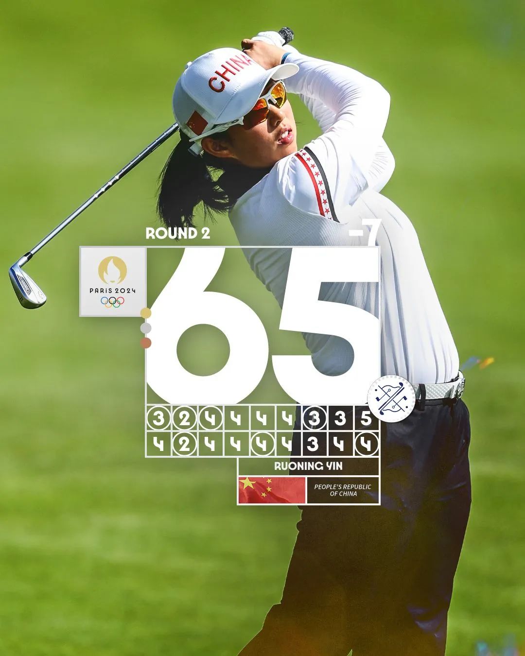 第一次参加奥运,殷若宁就打出了0柏忌的一轮球——也是巴黎奥运会女子高尔夫目前唯一一张bogey-free记分卡!