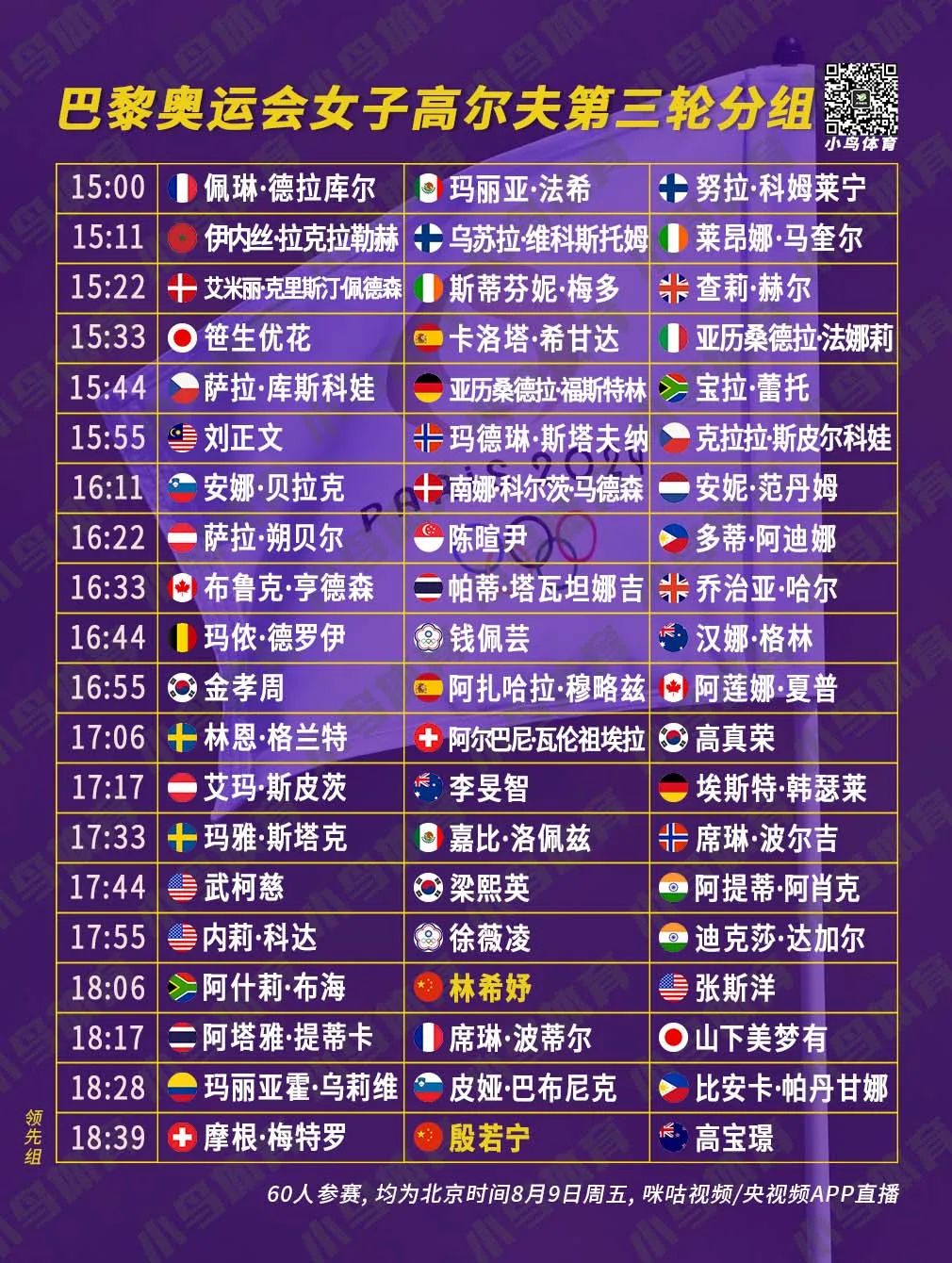 北京时间今天傍晚18:39,殷若宁将从最后一组开球,与单独领先的瑞士黑马摩根·梅特罗、以及单独第三的新西兰名将高宝璟一道,展开奥运会移动日的征程。